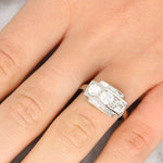The ring features a central old cut diamond, rub over set within a milgrain edged line, giving it exquisite detail and vintage charm. On either side of the central stone are three baguette cut diamonds, creating a striking Art Deco inspired design that leads to a solid platinum band.