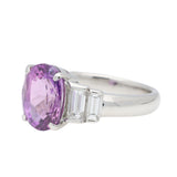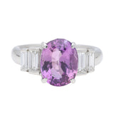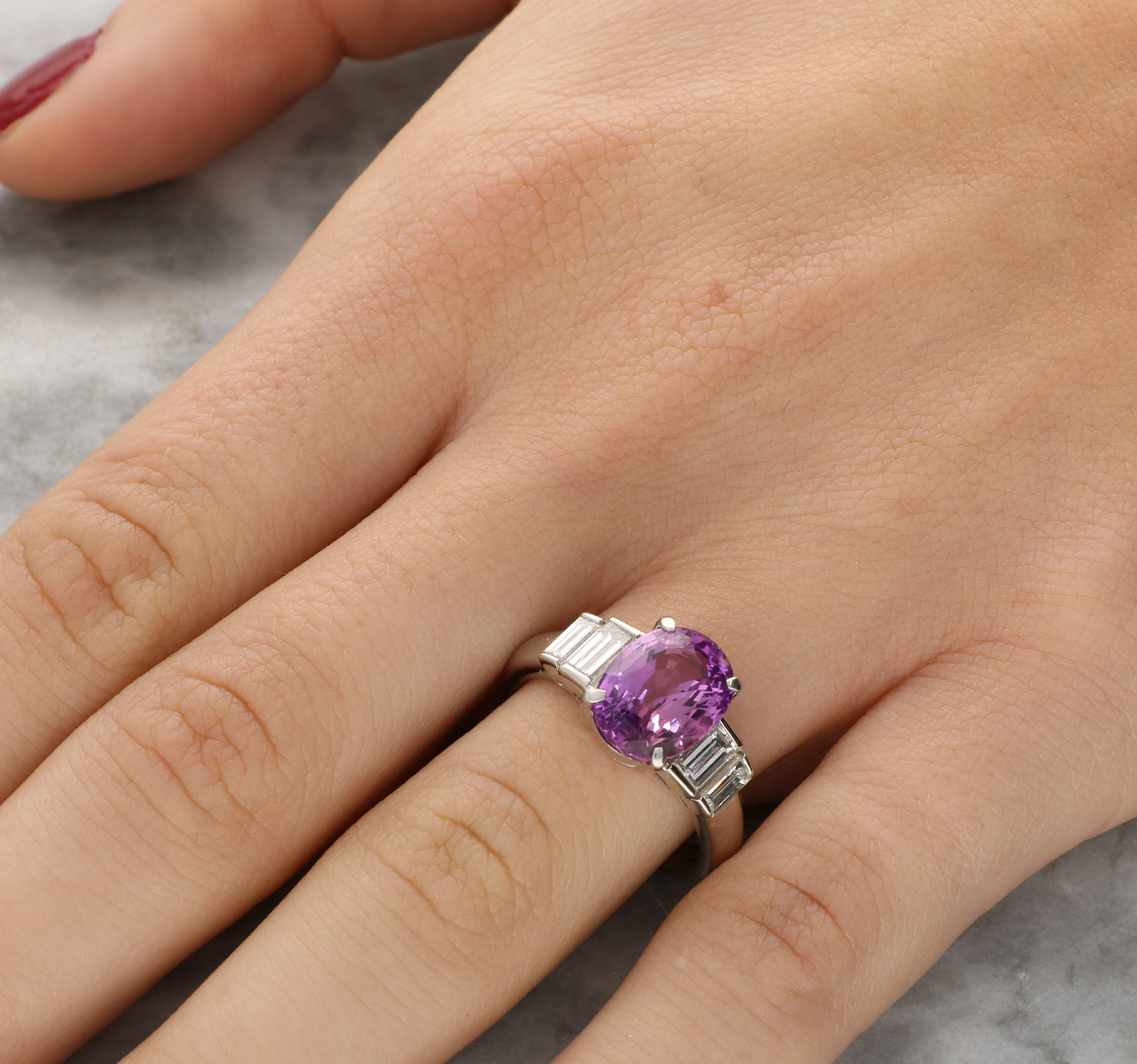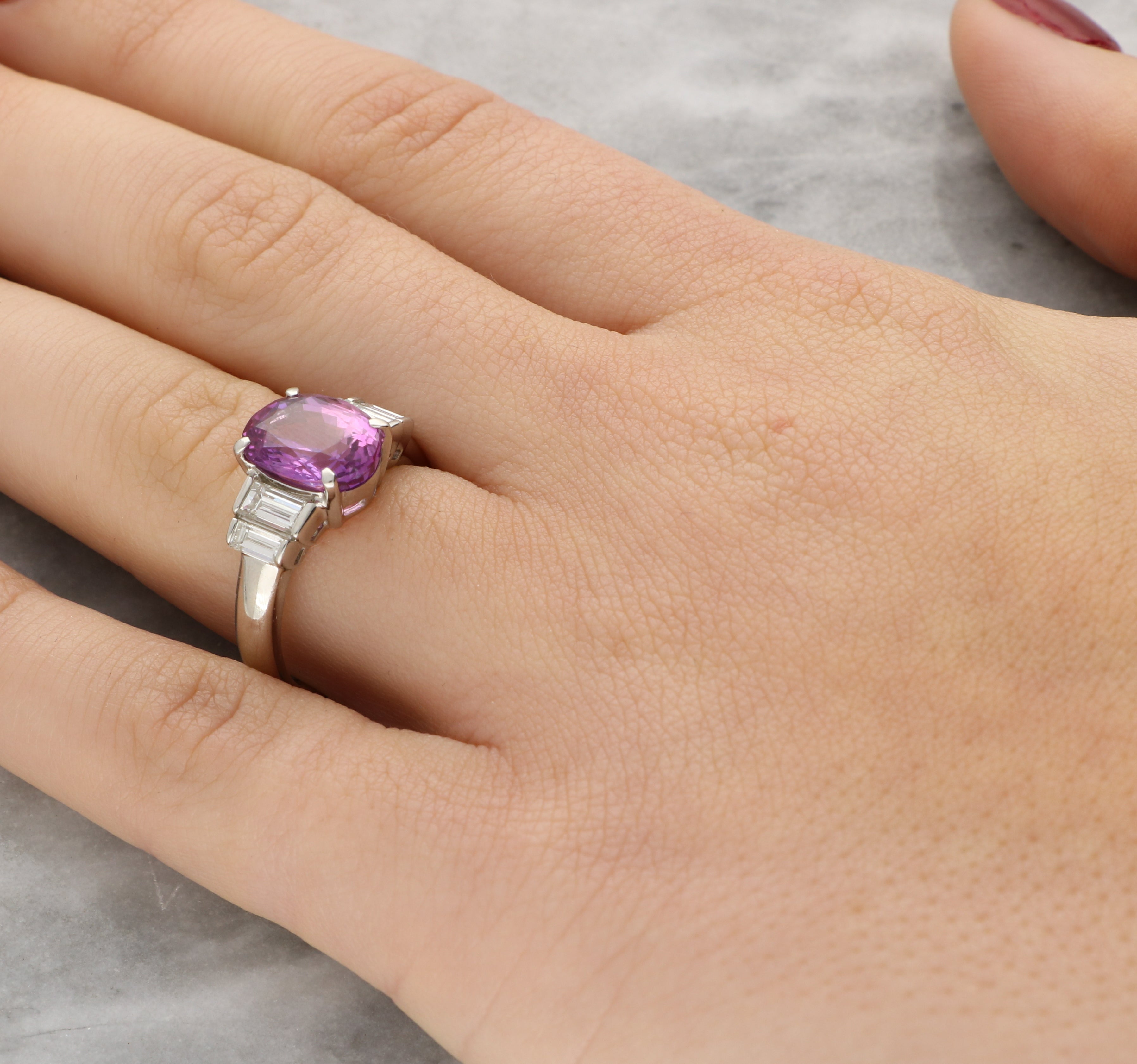 This ring centrally set with an oval cut purple sapphire at the centre. The sapphire shows a bright, even colour and is held securely in a four claw platinum setting. On each side of the sapphire are two baguette cut diamonds. The stone set head leads into a solid platinum band.
