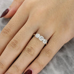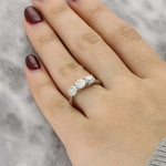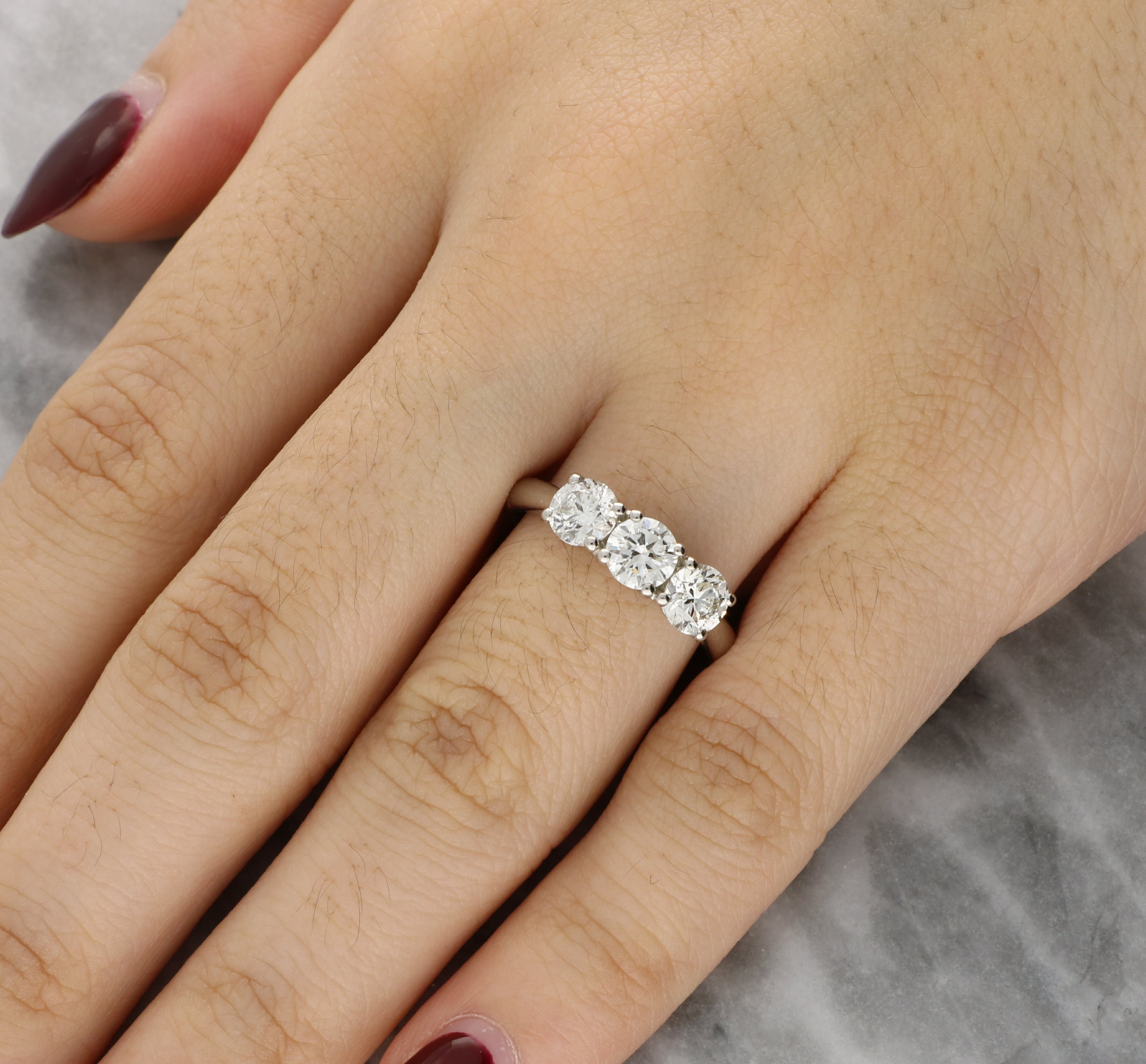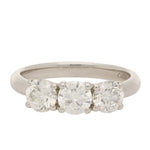 This ring is set in platinum and features three round brilliant cut diamonds arranged across the front of the band. Each diamond is claw set, allowing light to enter the stones and highlight their natural brilliance. The clean platinum band provides a cool contrast to the bright white diamonds.