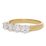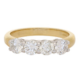 This ring is crafted in 18K yellow gold and features four round brilliant cut diamonds arranged in a classic four stone design across the front of the band. The diamonds are matched in size and set in a continuous row, creating a balanced and symmetrical appearance.