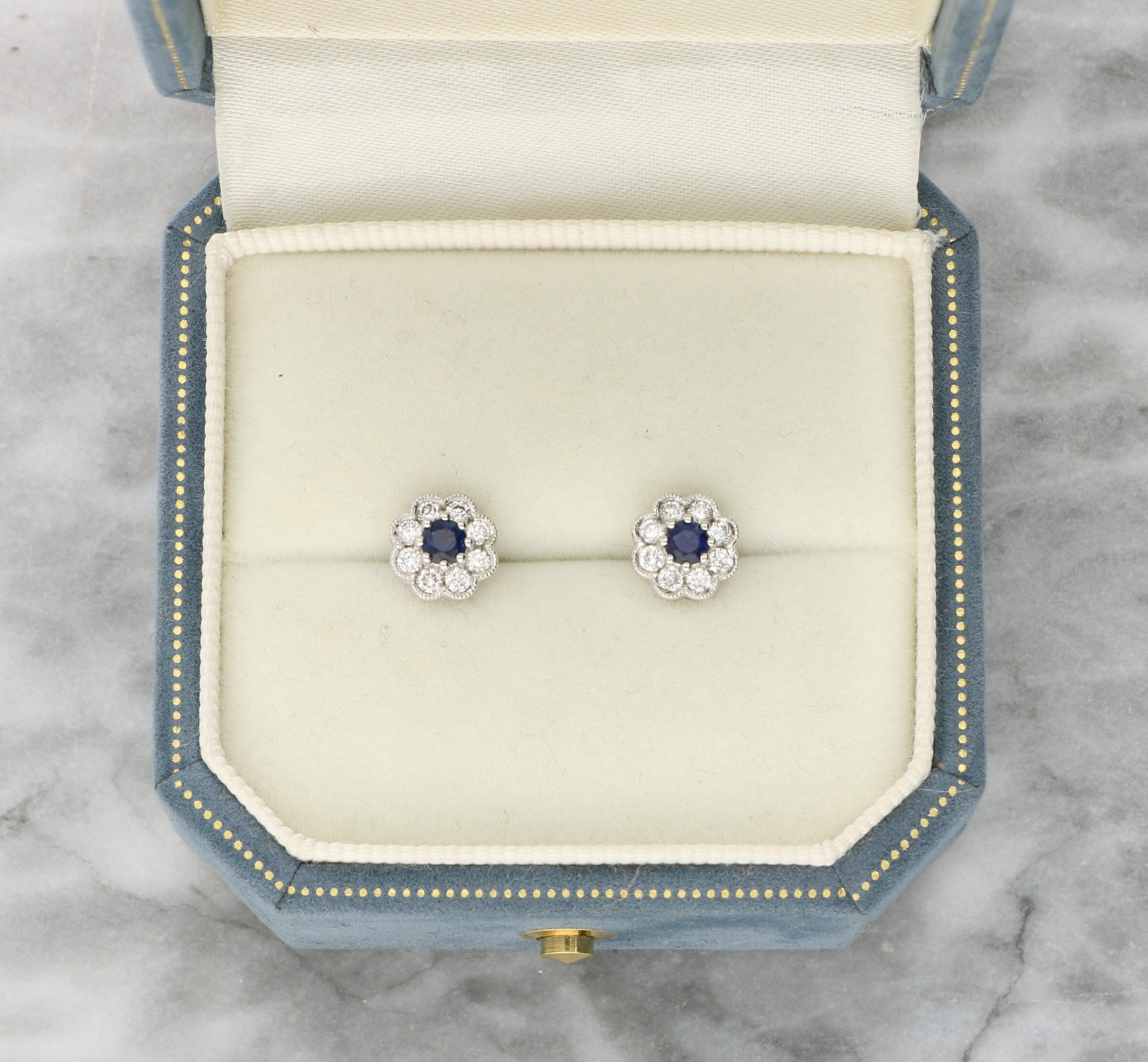 Each earring centres on an eight claw set round cut sapphire. This is surrounded by a halo of eight round brilliant cut diamonds that are bezel set with milgrain detailing. The scalloped edge creates a floral effect. The white gold making the stones vibrant colours pop. The earrings are secured to reverse with a white gold post and butterfly fitting.