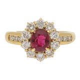 The ring is centrally set with a vibrant oval cut ruby, which is securely four claw set. The central stone is surrounded by a cluster of ten round brilliant cut diamonds which beautifully highlight the ruby, The head of the ring leads to a solid 18ct gold band, with three-round diamond set shoulders on each side.