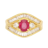 This gorgeous ring is crafted in rich 18K yellow gold and centred with a vibrant oval-cut ruby. Flanking the ruby are round brilliant-cut diamonds, adding crisp white sparkle and enhancing the intensity of the centre stone. Above and below, tapered rows of channel-set baguette diamonds form a bold, eye-shaped frame, creating a dynamic, sculptural silhouette.