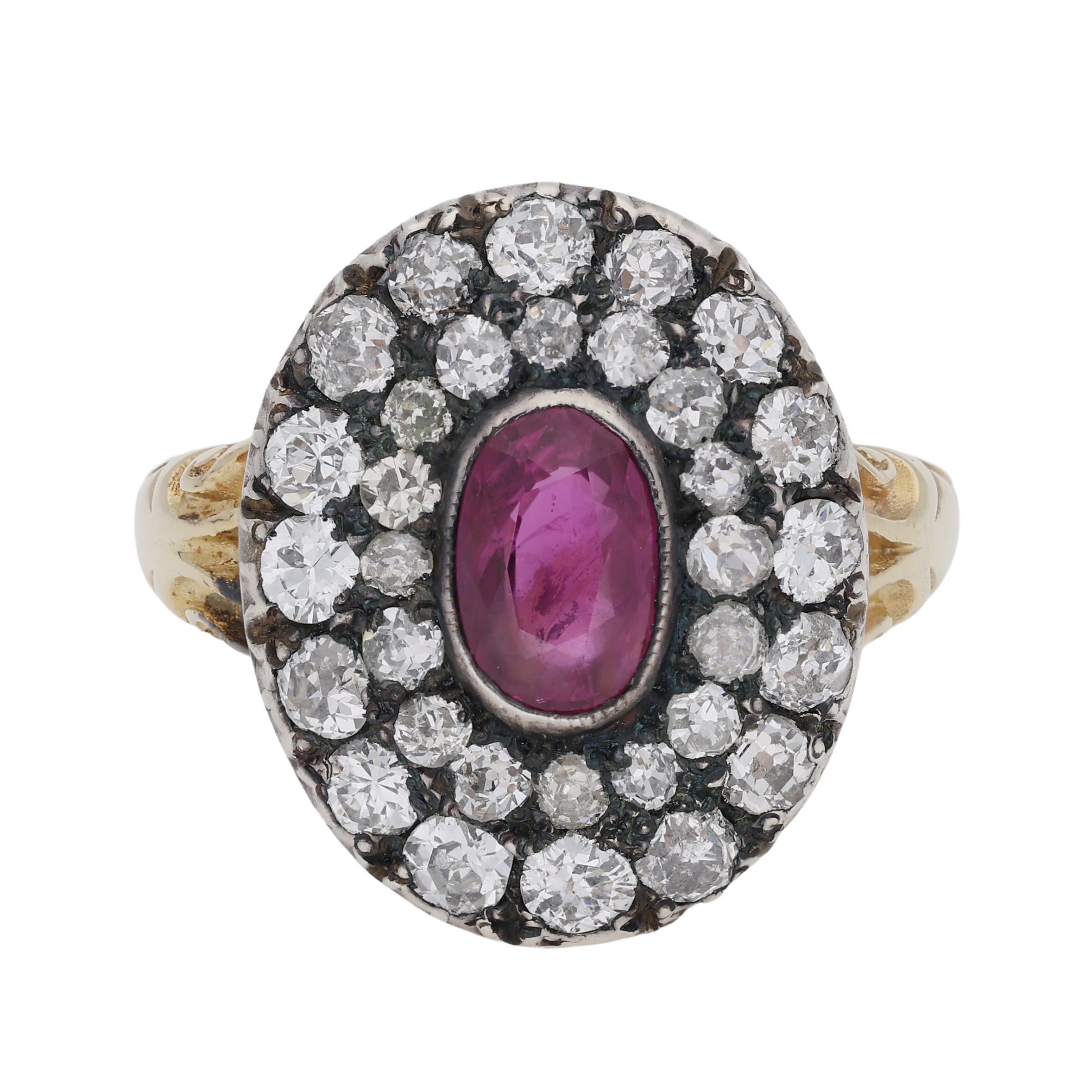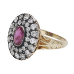 The ring is centrally set with a bezel set oval ruby, which is surrounded by a cluster of smaller diamonds. This cluster is further accented by a second layer of larger diamonds, all set in silver, creating a beautiful oxidised effect. The head of the ring flows into a solid 14ct yellow gold band with engraved shoulders.