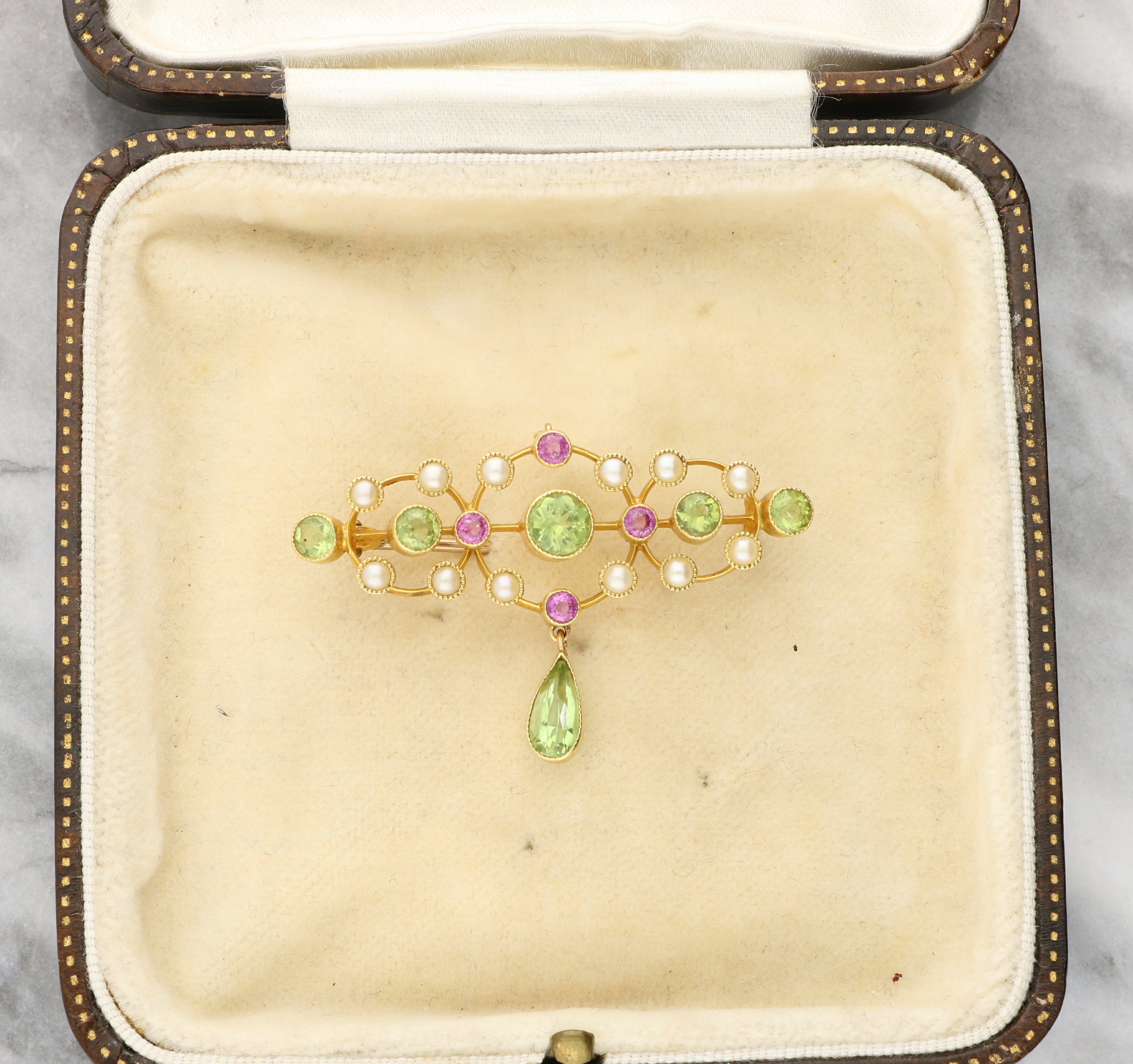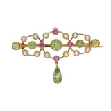 Peridot, Pink Stone and Pearl Brooch in 15ct Yellow Gold