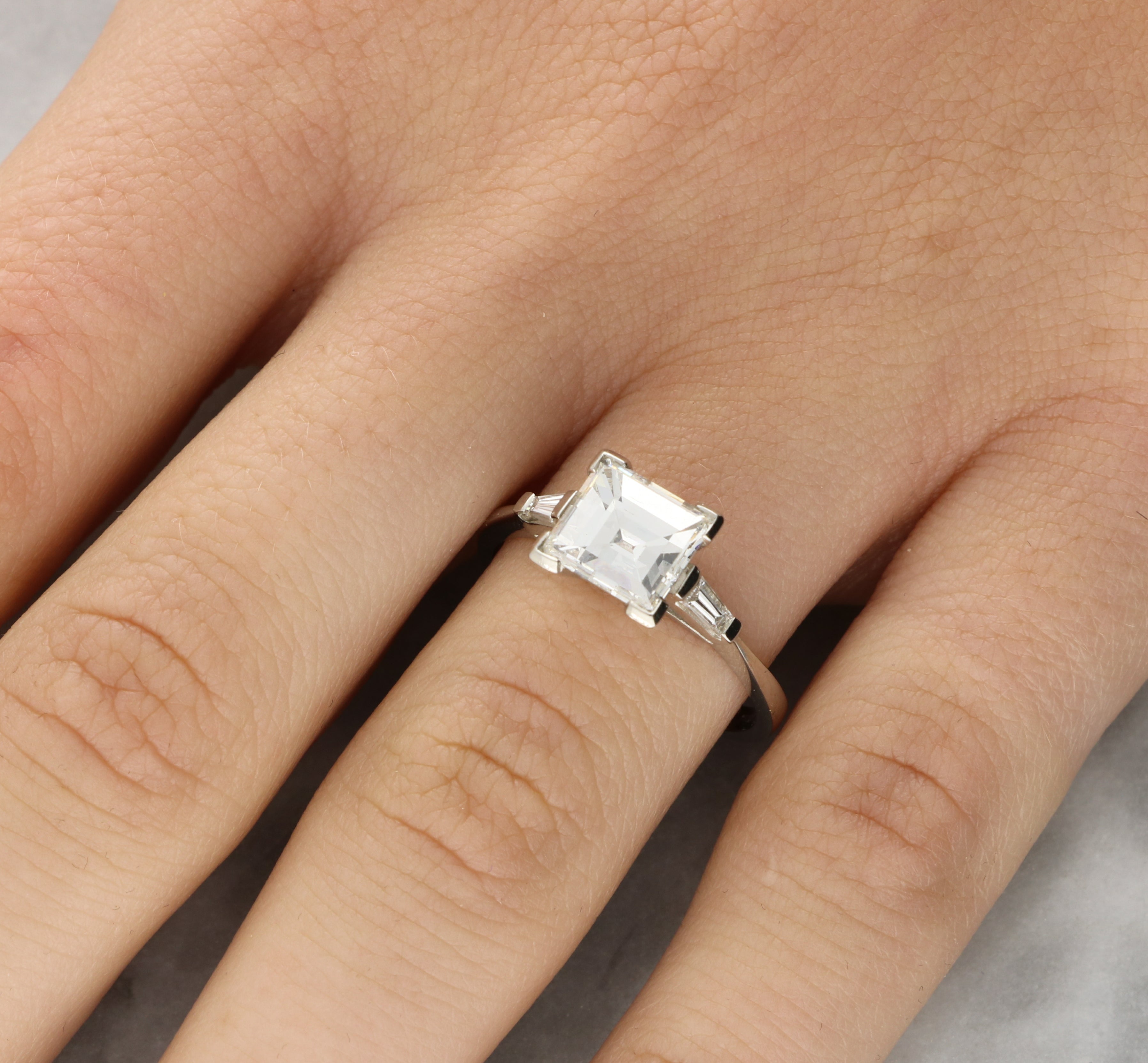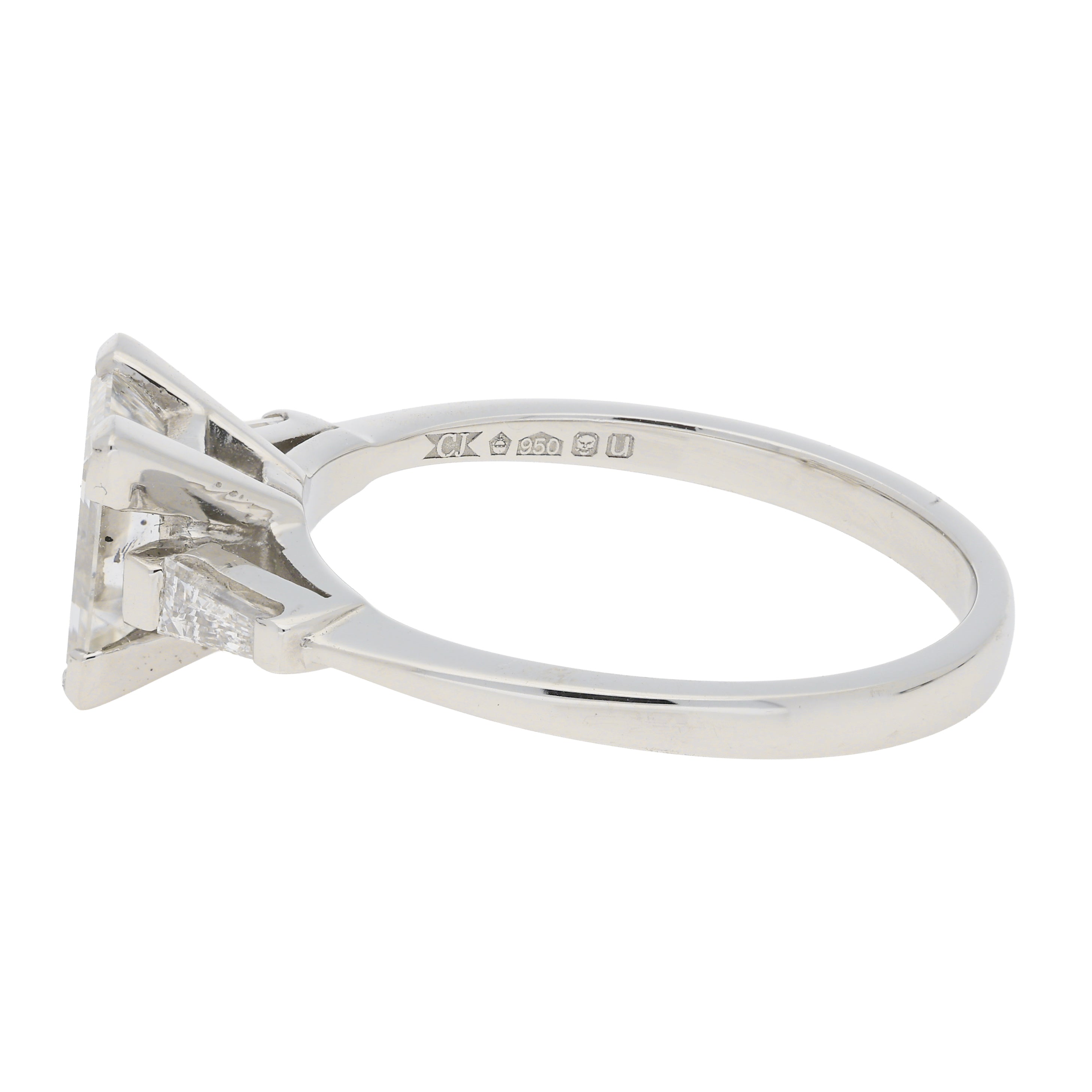 - Stone Weight: The central Asscher cut is certified by EDR as 1.47 carats, G in colour with VS2 clarity. The side tapered baguette cut diamonds have a estimated combined weight of 0.18 carat, G-H in colour with VVS clarity.
