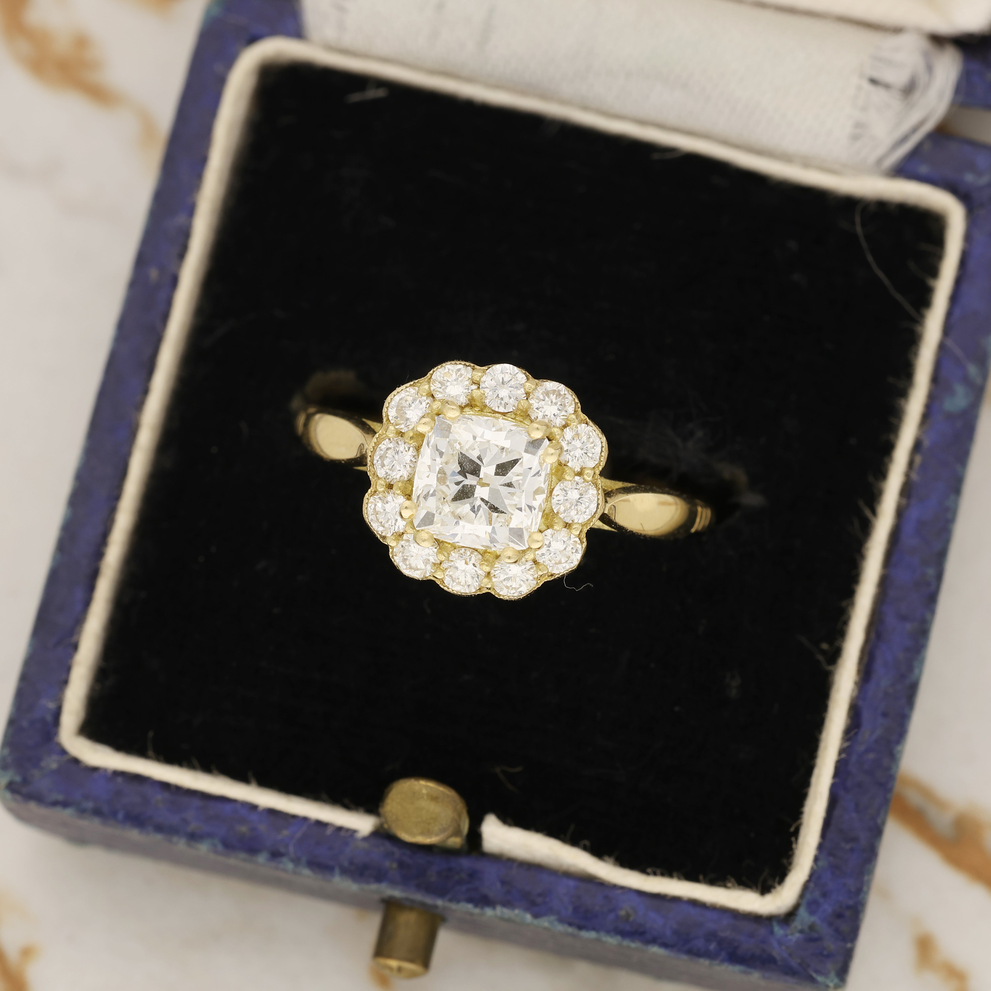 This 18ct yellow gold ring features a cushion cut diamond at its centre, held securely in a double four claw setting. Surrounding the diamond is a scalloped halo of round brilliant cut diamonds, each set with millegrain edging. The cluster sits on a tapered 18ct yellow gold band with subtle shoulder detailing.