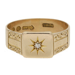 This elegant signet ring is crafted in 9K yellow gold and features a rectangular signet face centred with a single sparkling diamond, set within a finely engraved starburst motif. The diamond adds a subtle point of brilliance, drawing the eye to the clean, polished surface of the gold.