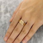 The shoulders of the ring are adorned with delicate engraved detailing, adding texture while complementing the classic signet silhouette.