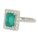This elegant ring features a centrally set emerald cut green emerald secured in a four claw setting. The vibrant centre stone is framed by a border of round brilliant cut diamonds arranged in a softly scalloped halo, creating a refined frame that enhances the emerald’s rich colour and clean step-cut facets.