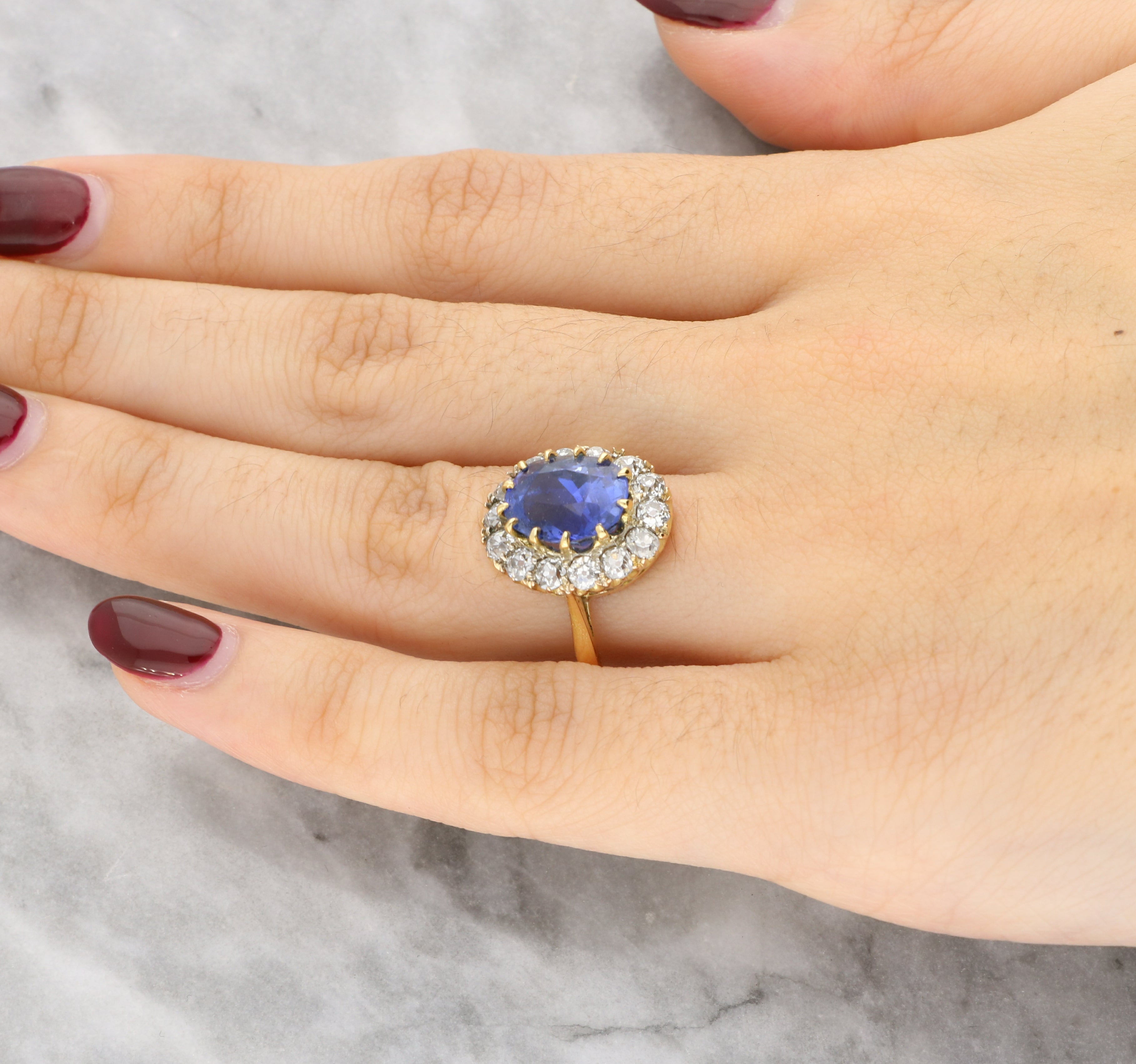 A classic cluster ring, centred with a richly coloured oval cut sapphire displaying a deep, vibrant blue hue. The sapphire is securely claw set and surrounded by a halo of sparkling old cut diamonds, creating a timeless floral-style cluster.