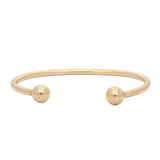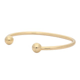 This sleek open bangle is crafted in polished 9K yellow gold and finished with smooth spherical terminals at each end. The clean, minimal silhouette highlights the warm glow of the gold, while the rounded ball accents add a subtle sculptural detail to the contemporary torque design.