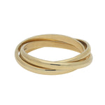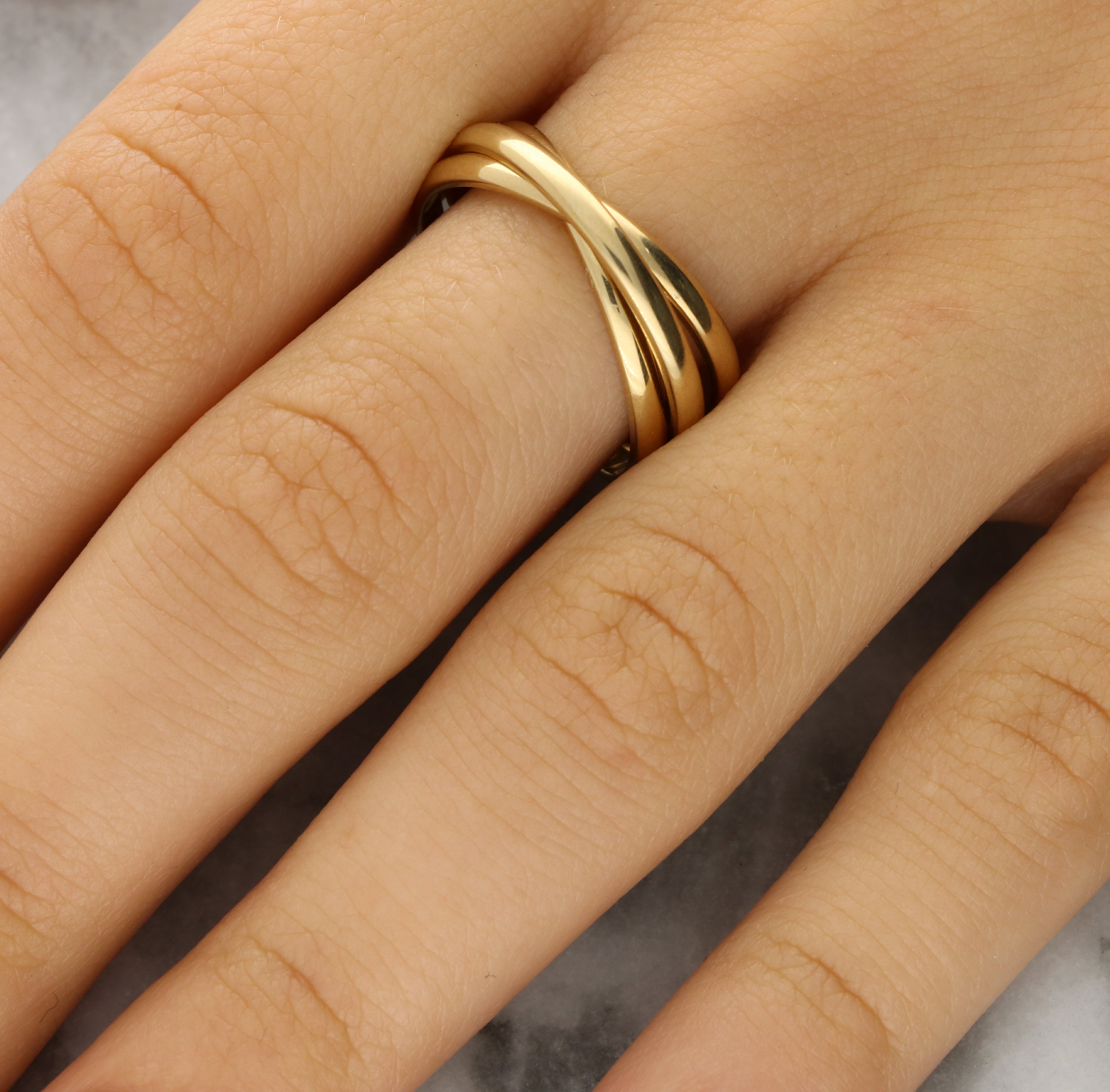 This piece is made up of three interlocking bands that roll seamlessly together when worn. Known as a Russian wedding ring or trinity ring, the design symbolises the intertwining of past, present, and future or, in some interpretations, love, fidelity, and friendship.