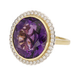 This striking ring centrally features a richly coloured oval cut amethyst, displaying deep violet tones. The amethyst is bezel set in yellow gold and framed by a halo of sparkling round brilliant cut diamonds bezel set in white gold. The head of the ring leads to a solid gold band.
