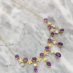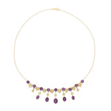 This elegant necklace is set with a graceful row of round cut amethysts, each displaying a rich violet hue. Between the amethysts sit delicate diamond set motifs, adding a refined sparkle and enhancing the vibrancy of the purple stones.
