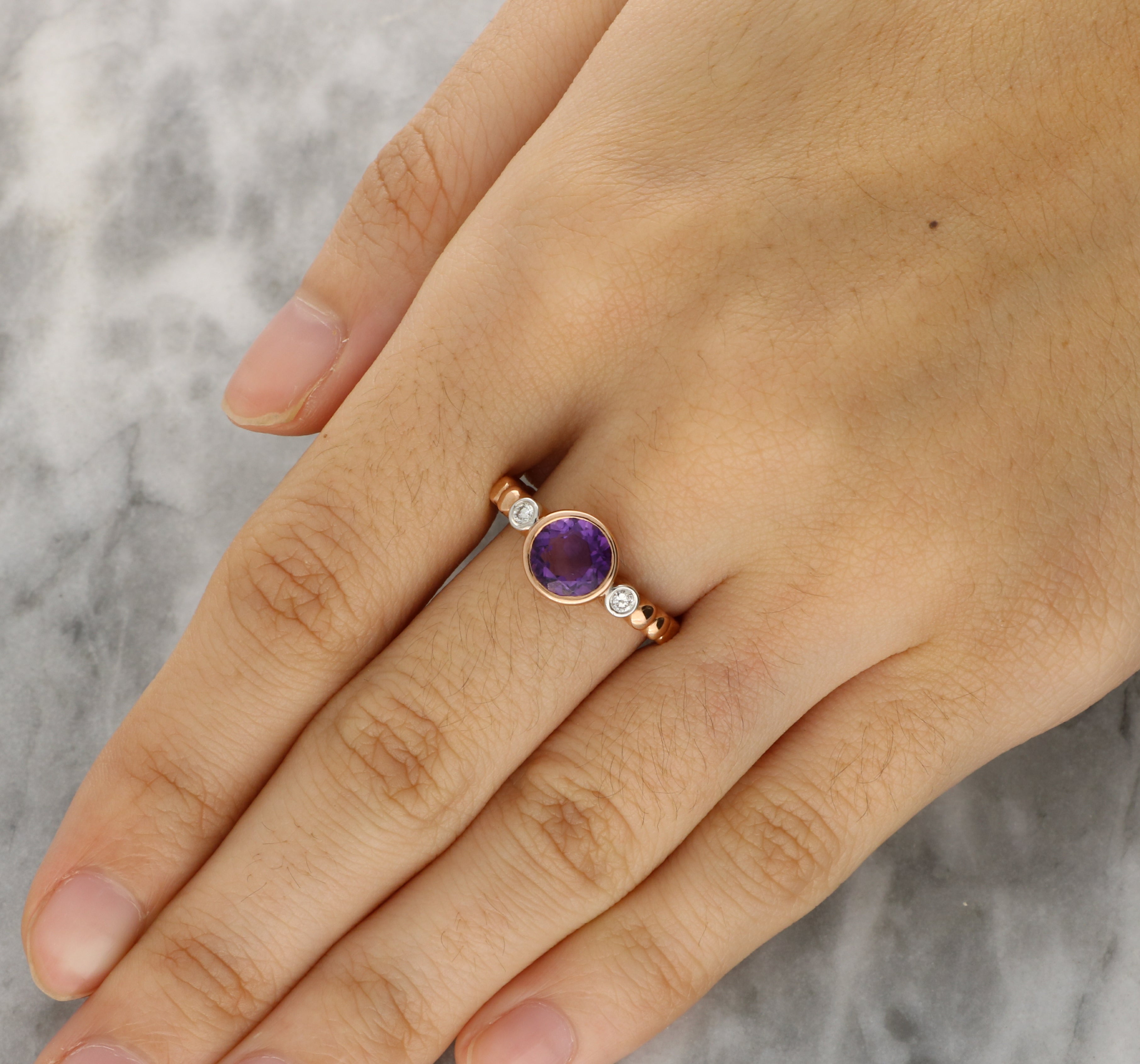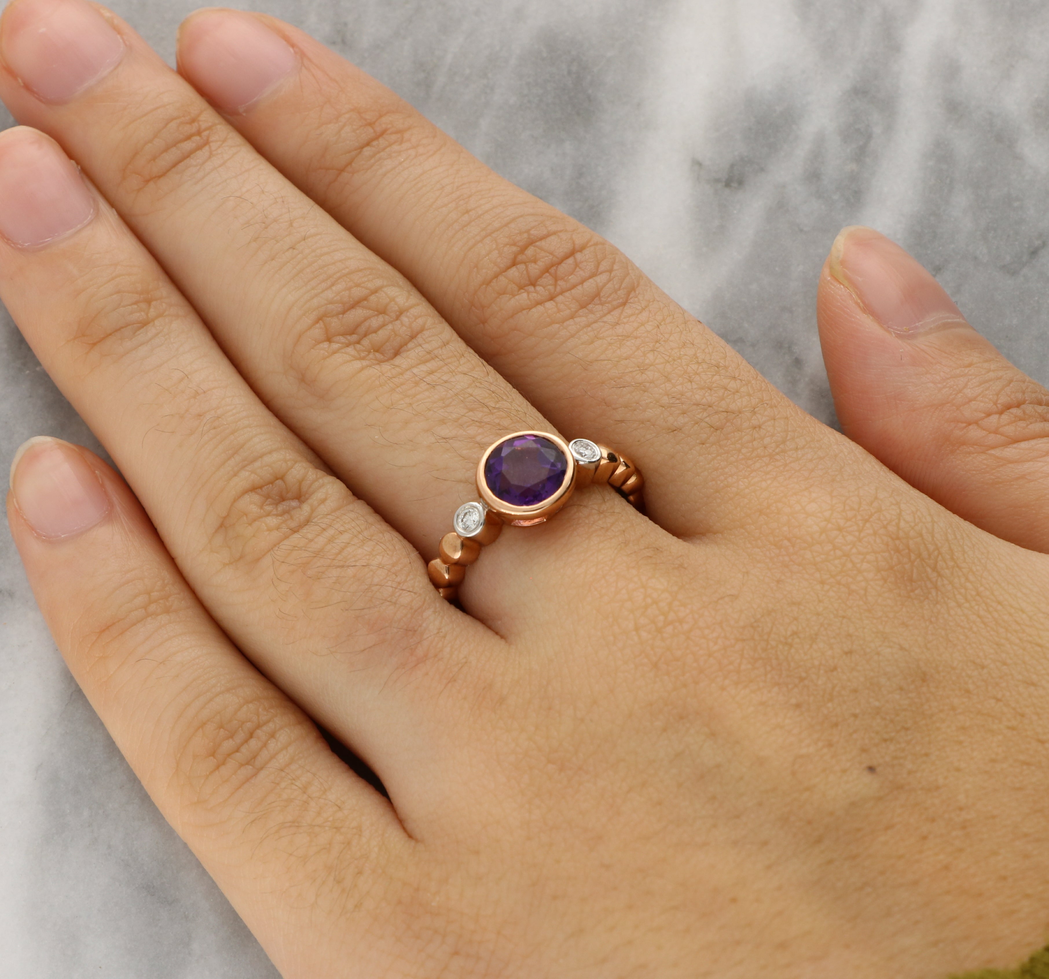 Set to either side of the amethyst are two sparkling round brilliant-cut diamonds, each framed in white gold to enhance their crisp brilliance and provide a subtle contrast against the rose gold band. The gently textured, softly contoured shoulders add character to the design.