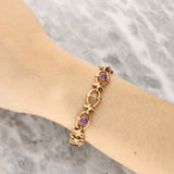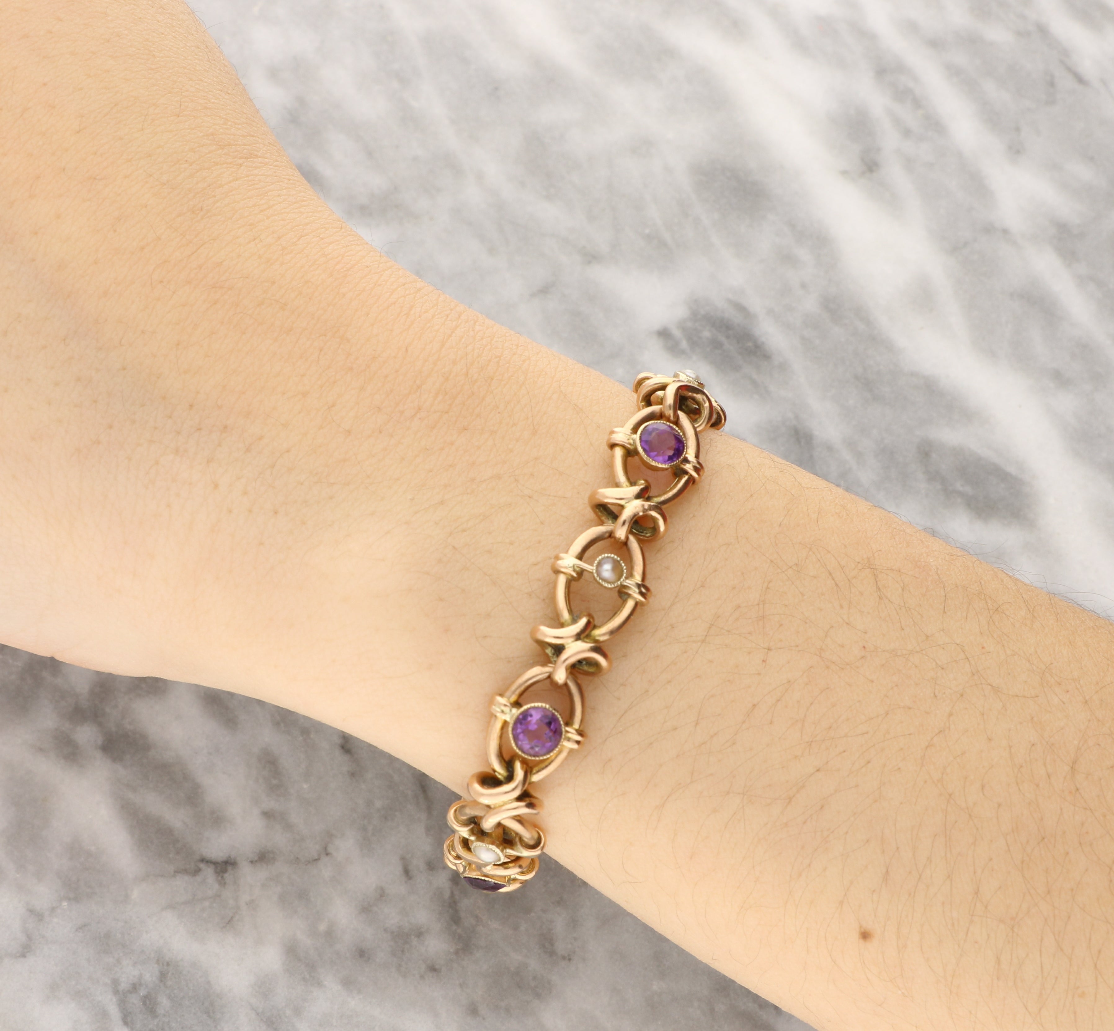 This charming bracelet features a series of oval yellow gold links, each set alternately with round-cut amethysts and delicate seed pearls. The rich purple hues of the amethysts contrast beautifully with the soft lustre of the pearls, while the gently curved gold connectors create a flowing, decorative rhythm throughout the design. A classic heart-shaped padlock clasp completes the piece, adding both security and romantic appeal.