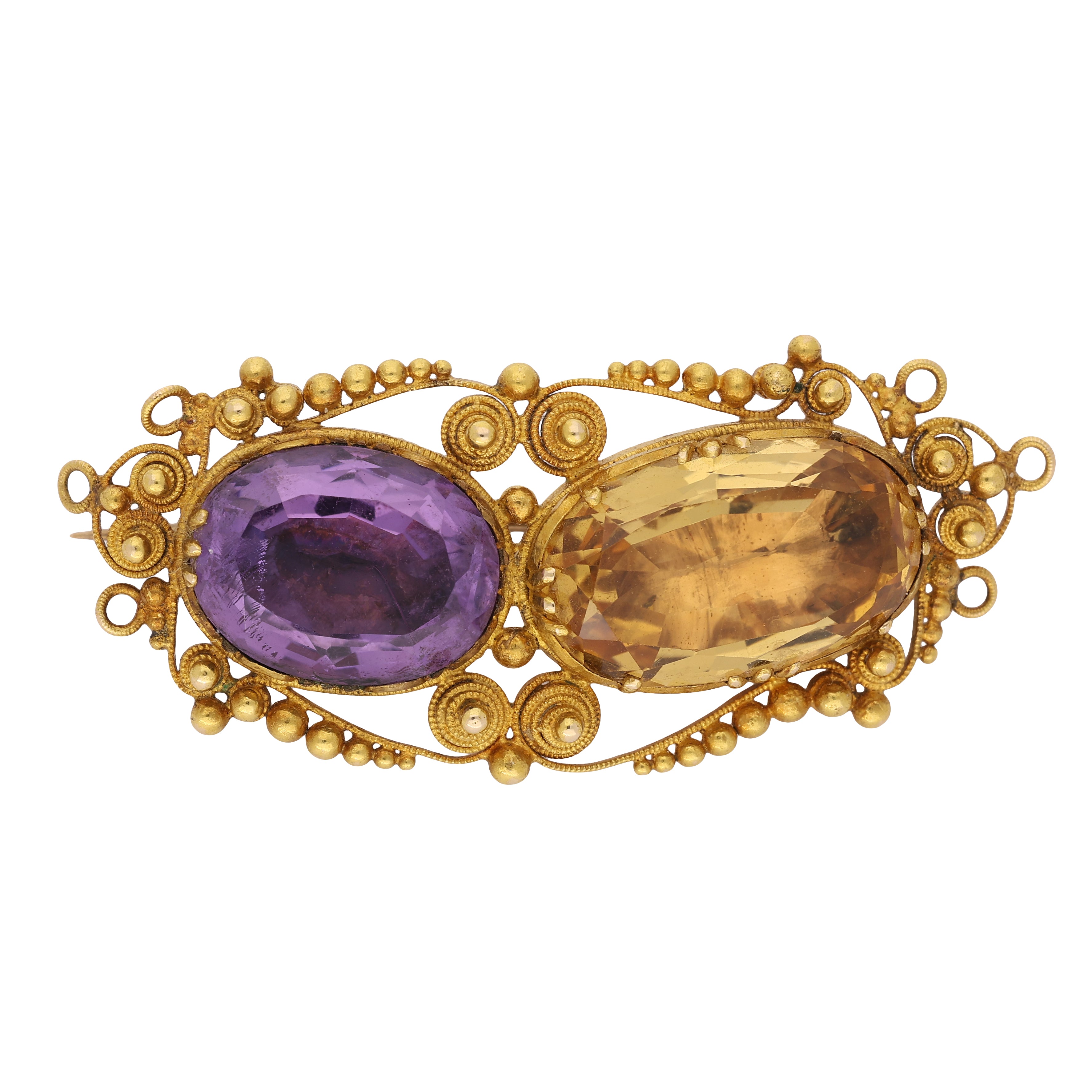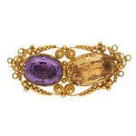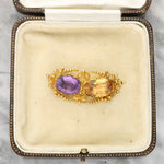 This ornate Victorian brooch is set with two striking oval cut gemstones, a rich purple amethyst and a warm golden topaz, positioned side by side in an elegant horizontal design. Each stone is securely set within a delicate gold frame.