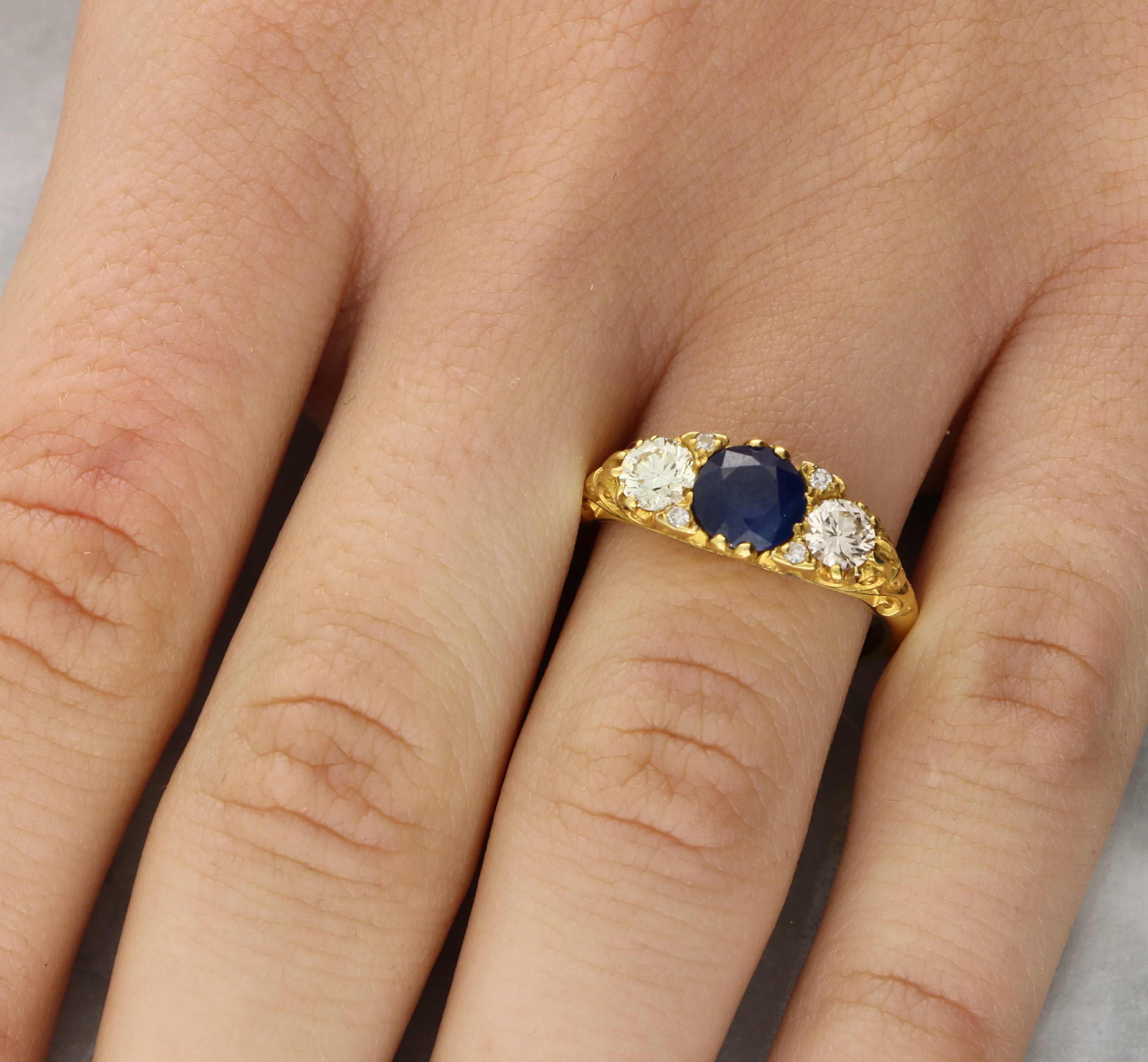 The ring centrally features a beautiful round cut blue sapphire which is securely claw set in yellow gold. The sapphire is sided by two round cut diamonds similarly claw set. Between the central sapphire and each side diamond sit two smaller accent diamonds, enhancing the sparkle. The stones are set in a antique style scrolled mounting; leading to a solid gold band.