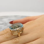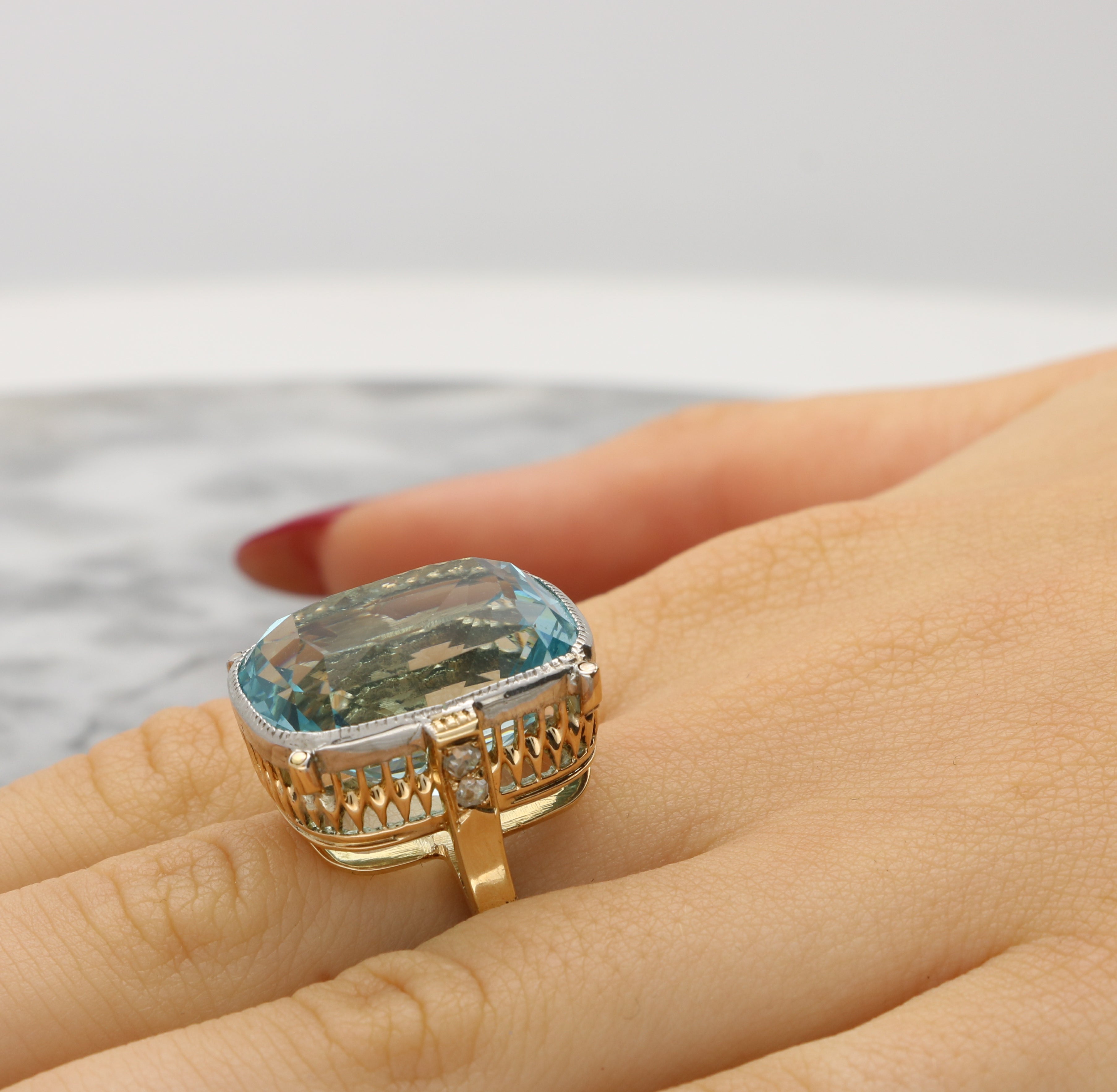The ring features a cushion cut aquamarine, bezel set within an intricate yellow gold basket. Each shoulder is accented with two old cut diamonds, adding a soft sparkle that catches the light from the side. The head of the ring leads to a solid yellow gold band.