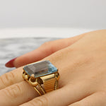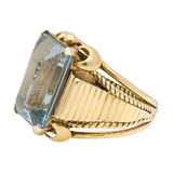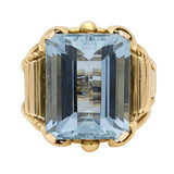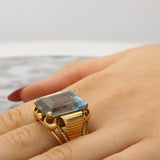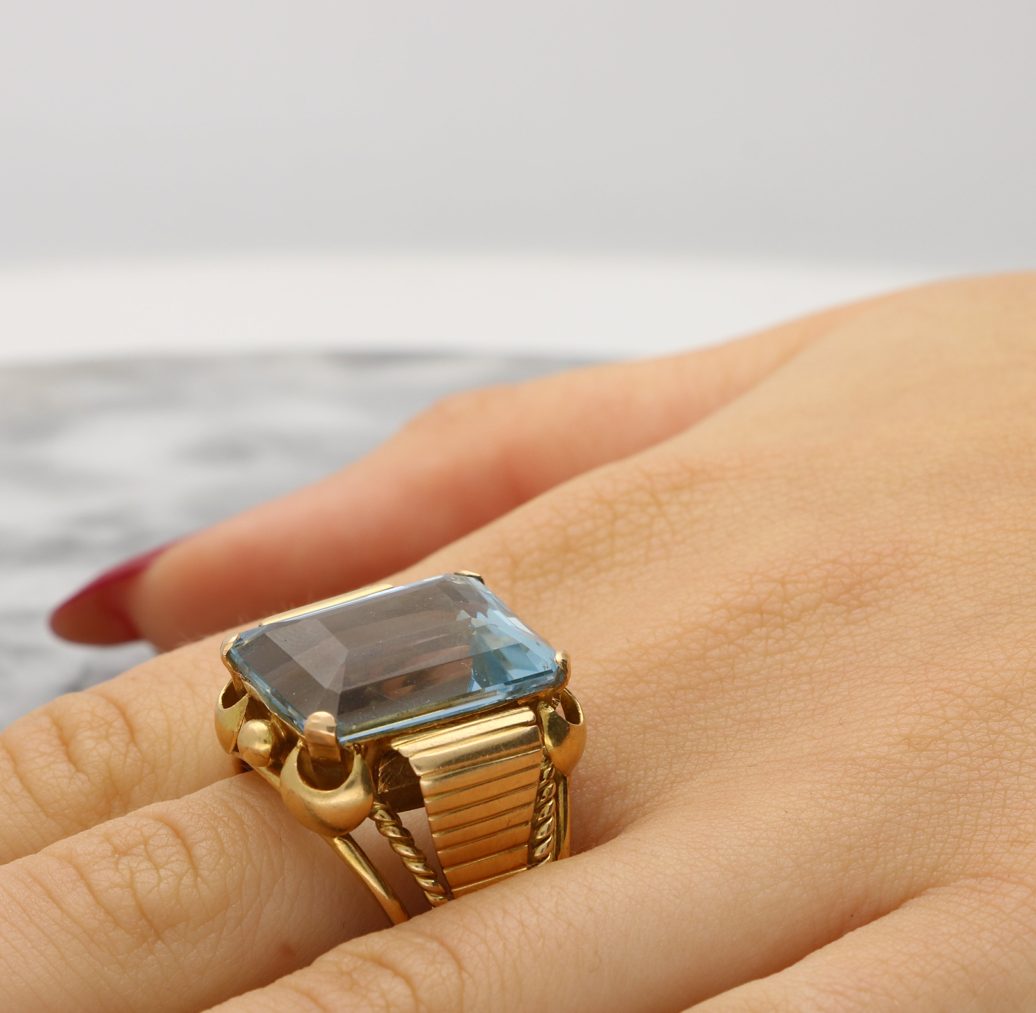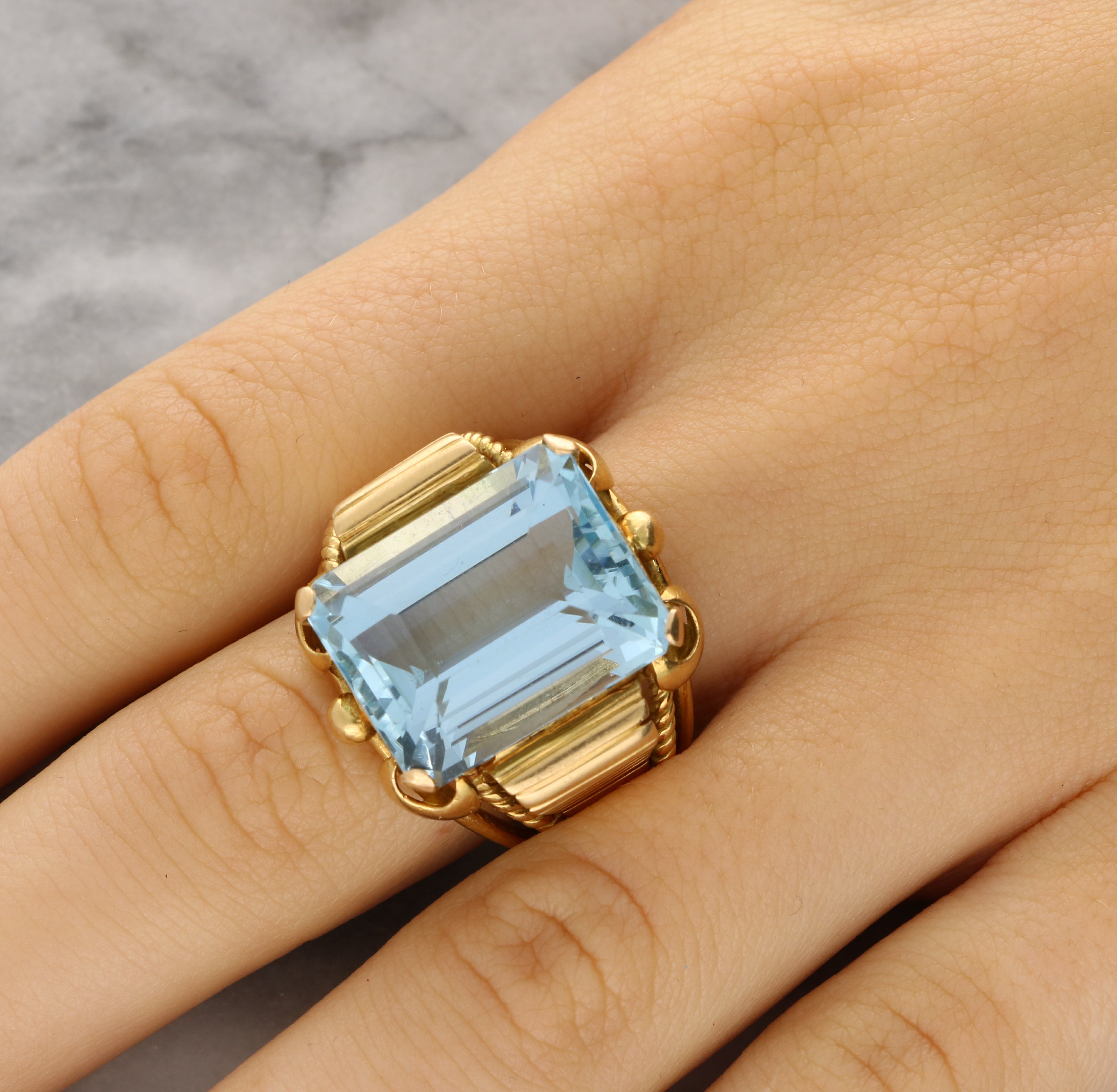 This vintage aquamarine ring makes a striking statement and would be a wonderful gift or a standout cocktail ring. The rich yellow gold complements the cool blue tones of the aquamarine, creating a balanced and eye-catching design.