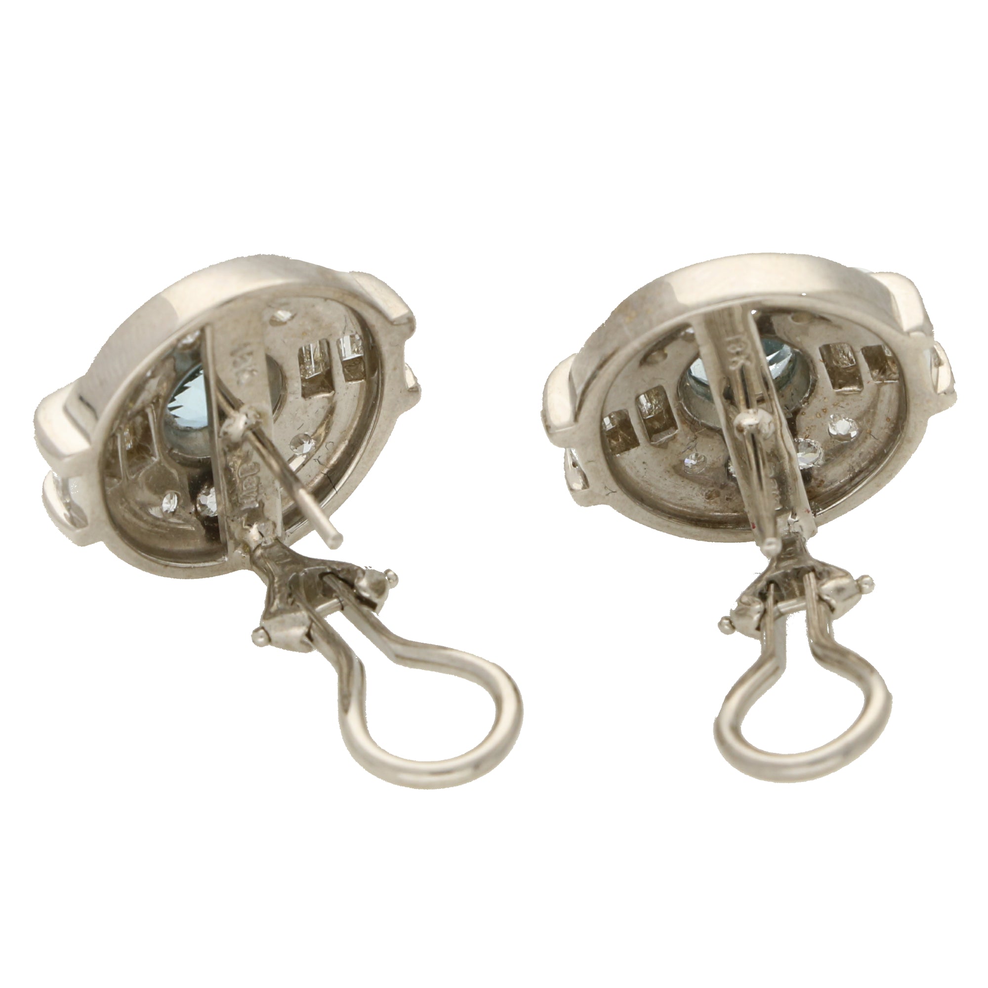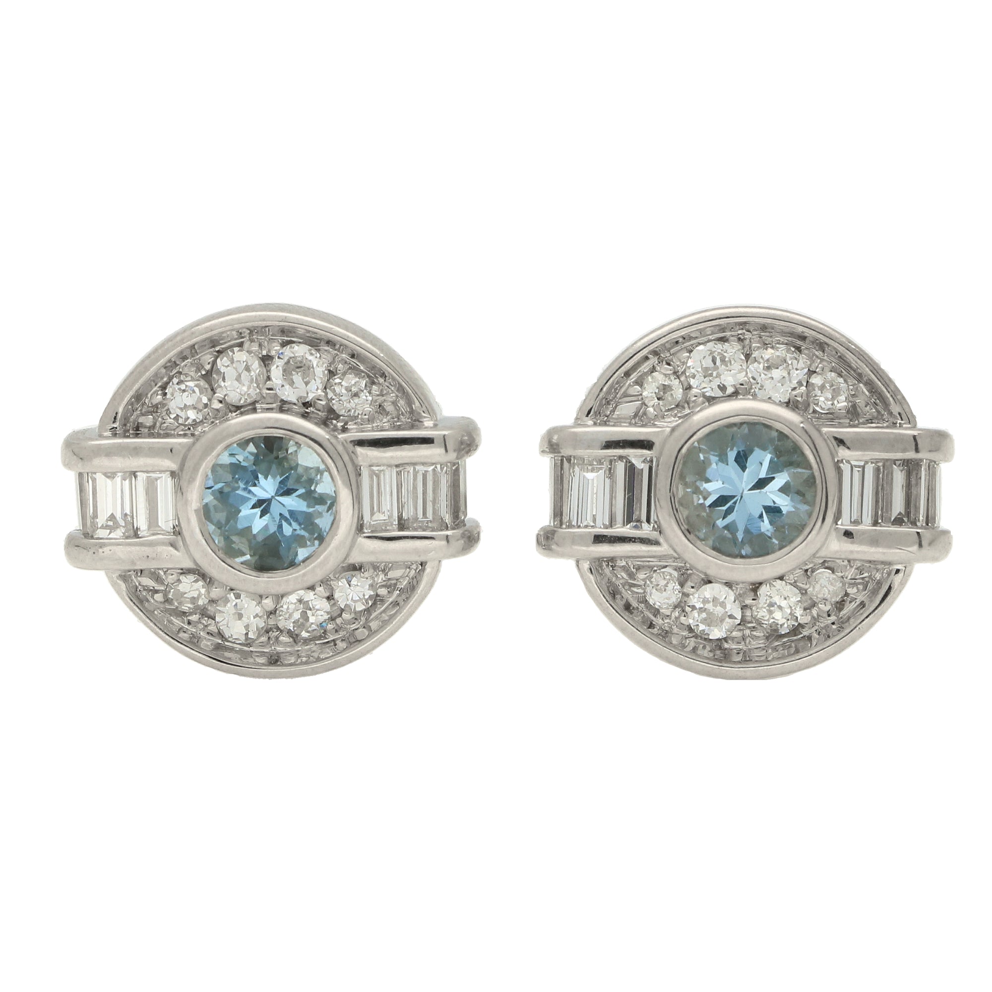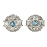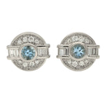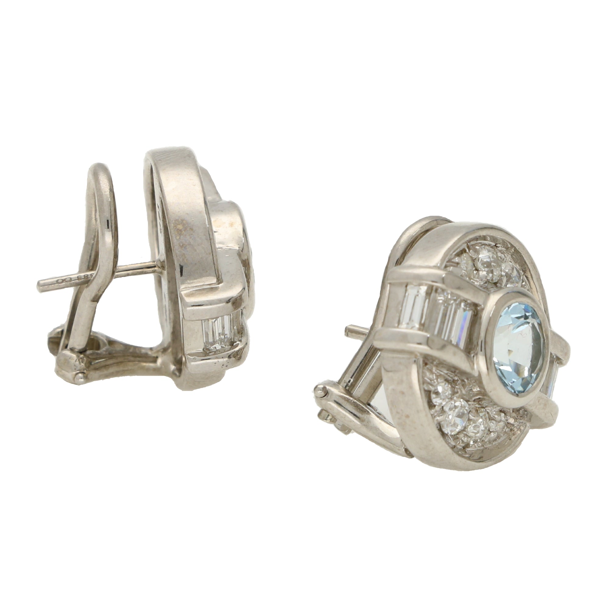 Each earring is centrally set with a vibrant sky blue coloured aquamarine stone which is securely rub over set. The aquamarine is sided by two panels of baguette cut diamonds and surrounded by old cut diamonds. They are secured to reverse with a post and omega clip fitting.