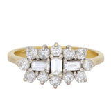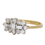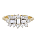 This ring features a structured diamond cluster design centred around three baguette-cut diamonds. The central baguette is set vertically, while two additional baguette diamonds sit horizontally on either side, creating a balanced geometric arrangement. Surrounding the baguettes is a border of round brilliant-cut diamonds that form a soft, scalloped outline.