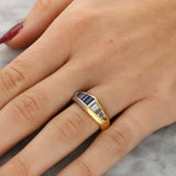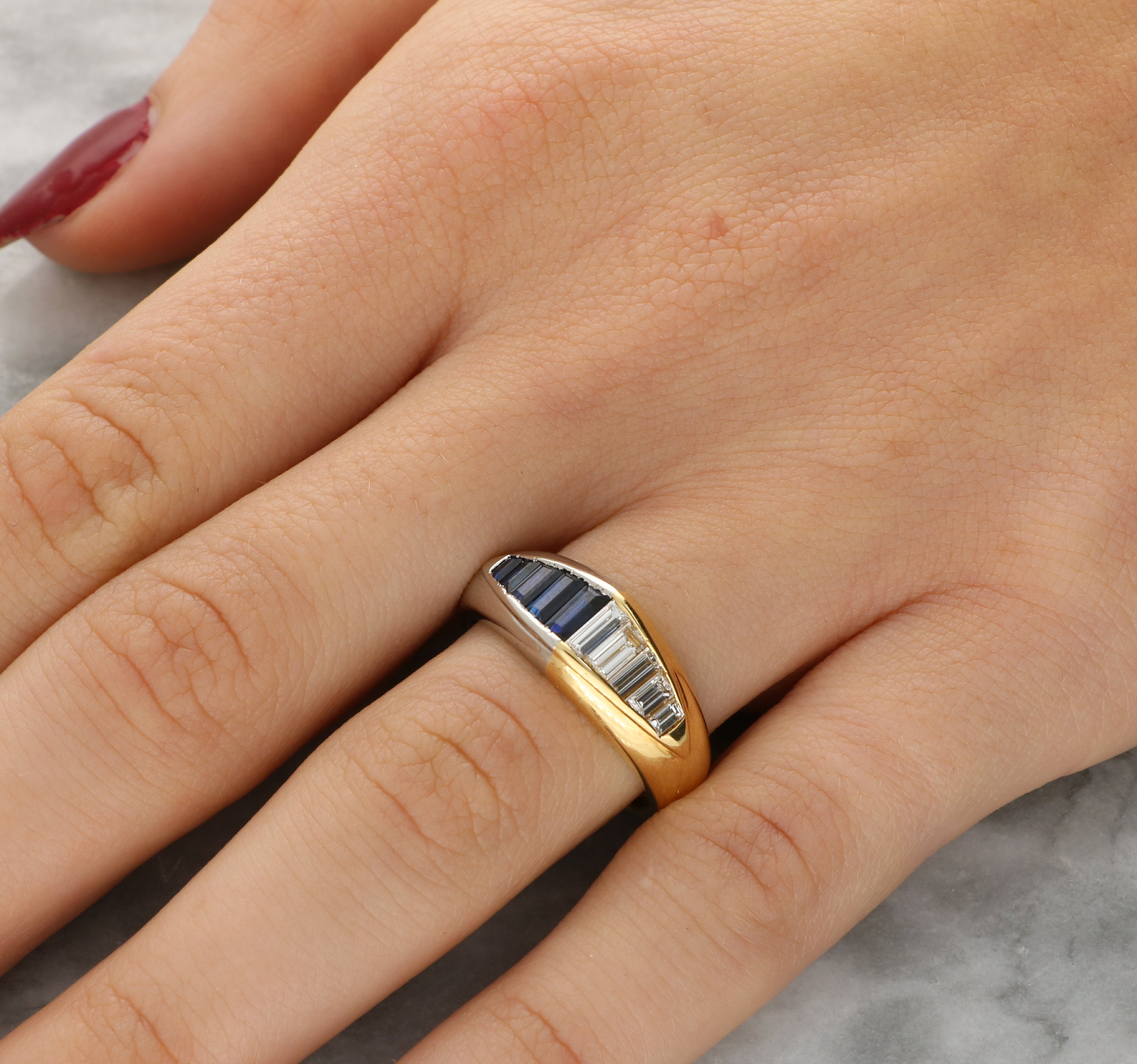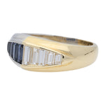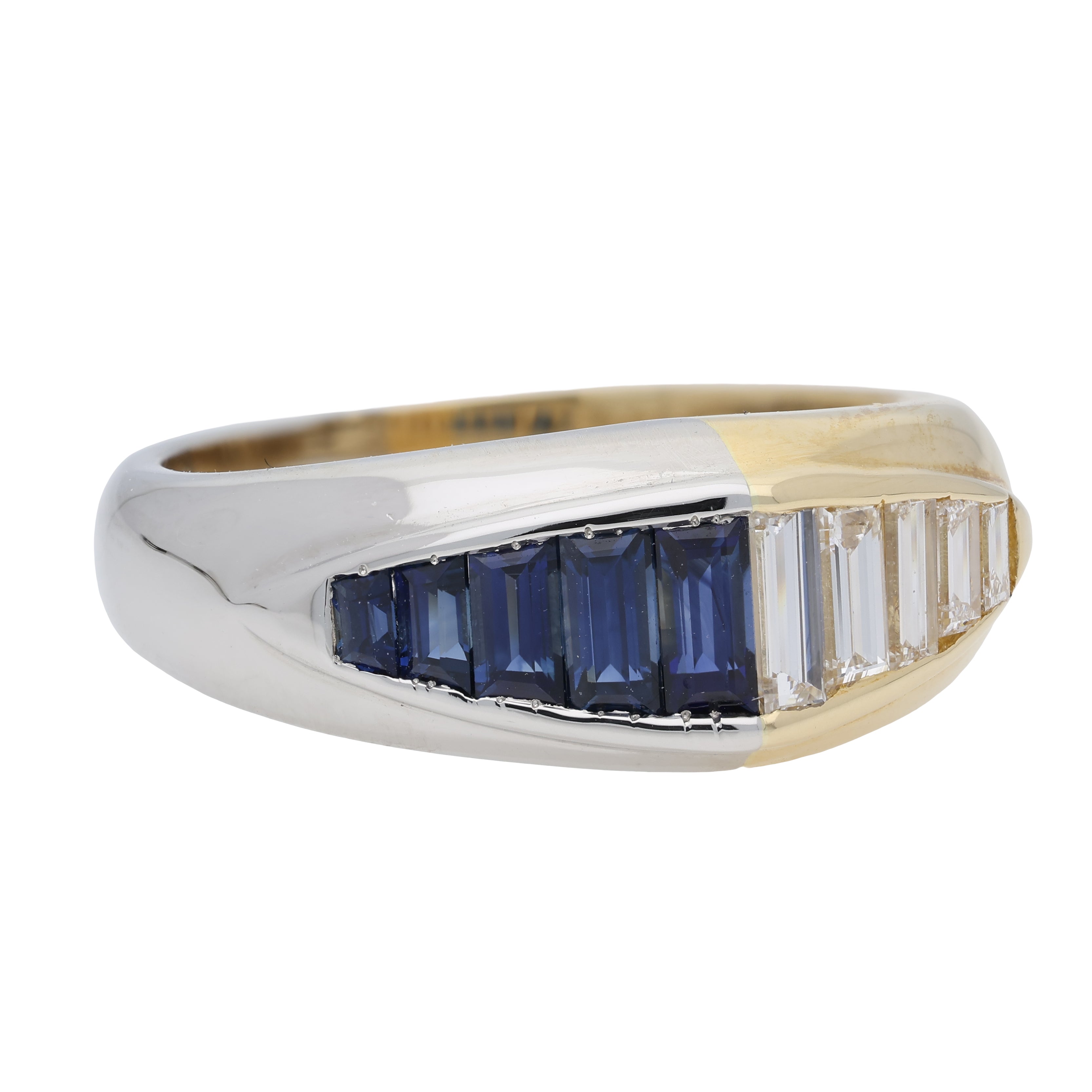 This ring is crafted in a combination of 18ct yellow gold and platinum, with each metal forming one half of the band. Set into the platinum side is a tapered row of baguette cut sapphires, graduating in size and showing a rich, deep blue colour. On the 18ct yellow gold side, a matching tapered row of baguette cut diamonds continues the design, giving a bright contrast to the sapphires.