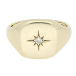 This vintage signet ring is set in 18ct yellow gold and features a round brilliant cut diamond star set into the centre. The diamond is neatly set within a hand engraved star motif.