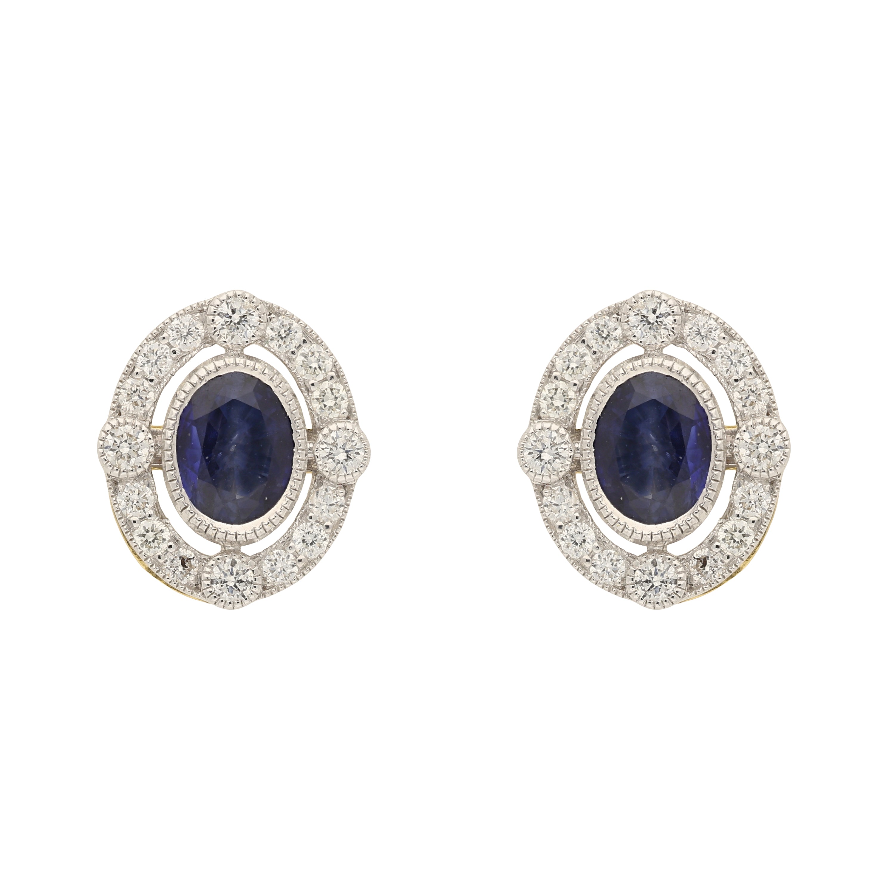 Each earring is centrally set with an oval cut deep blue sapphire, beautifully framed within a fine milgrain collet. The vibrant sapphires are surrounded by an open oval halo of brilliant-cut diamonds, with additional diamond accents at the cardinal points, creating an eye-catching design.