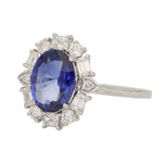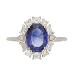 A lovely cluster ring centred with an oval-cut sapphire of rich, velvety blue. Encircling the centre stone is a beautifully arranged halo of mixed-cut diamonds, including round brilliant and baguette cuts, carefully positioned to enhance both sparkle and symmetry. The contrast between the crisp white brilliance of the diamonds and the saturated blue of the sapphire creates an eye-catching composition. All stones are claw-set in 18ct white gold, allowing maximum light to pass through and intensify their natural radiance.
