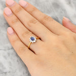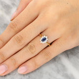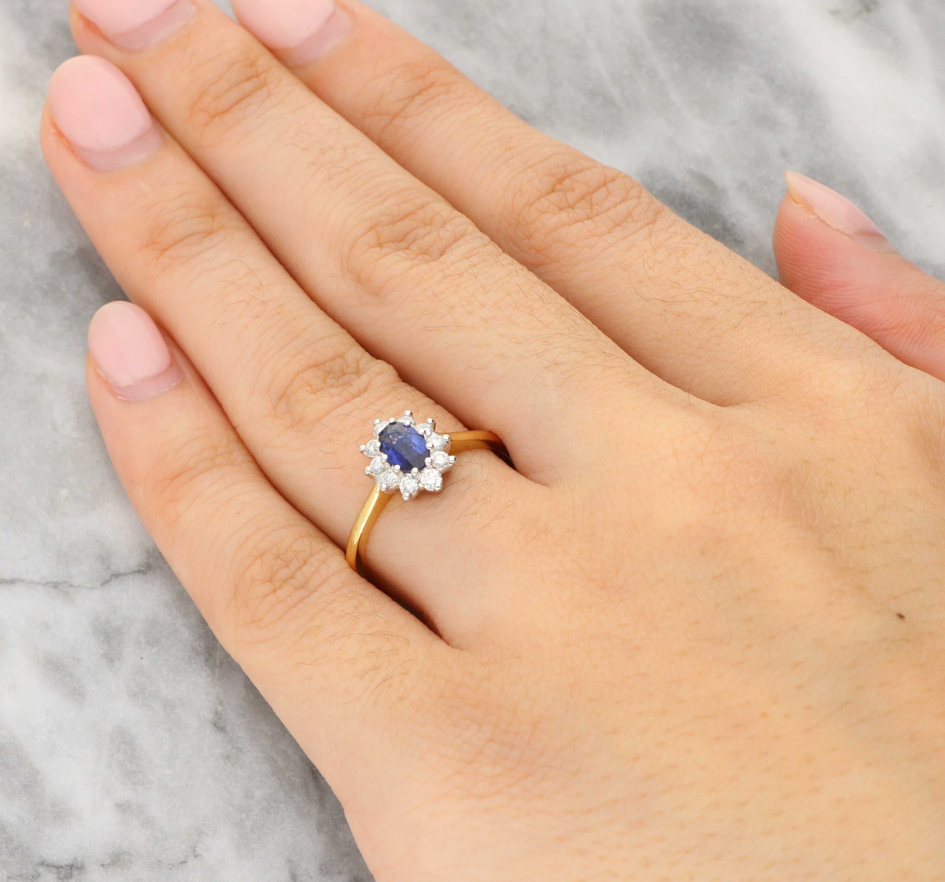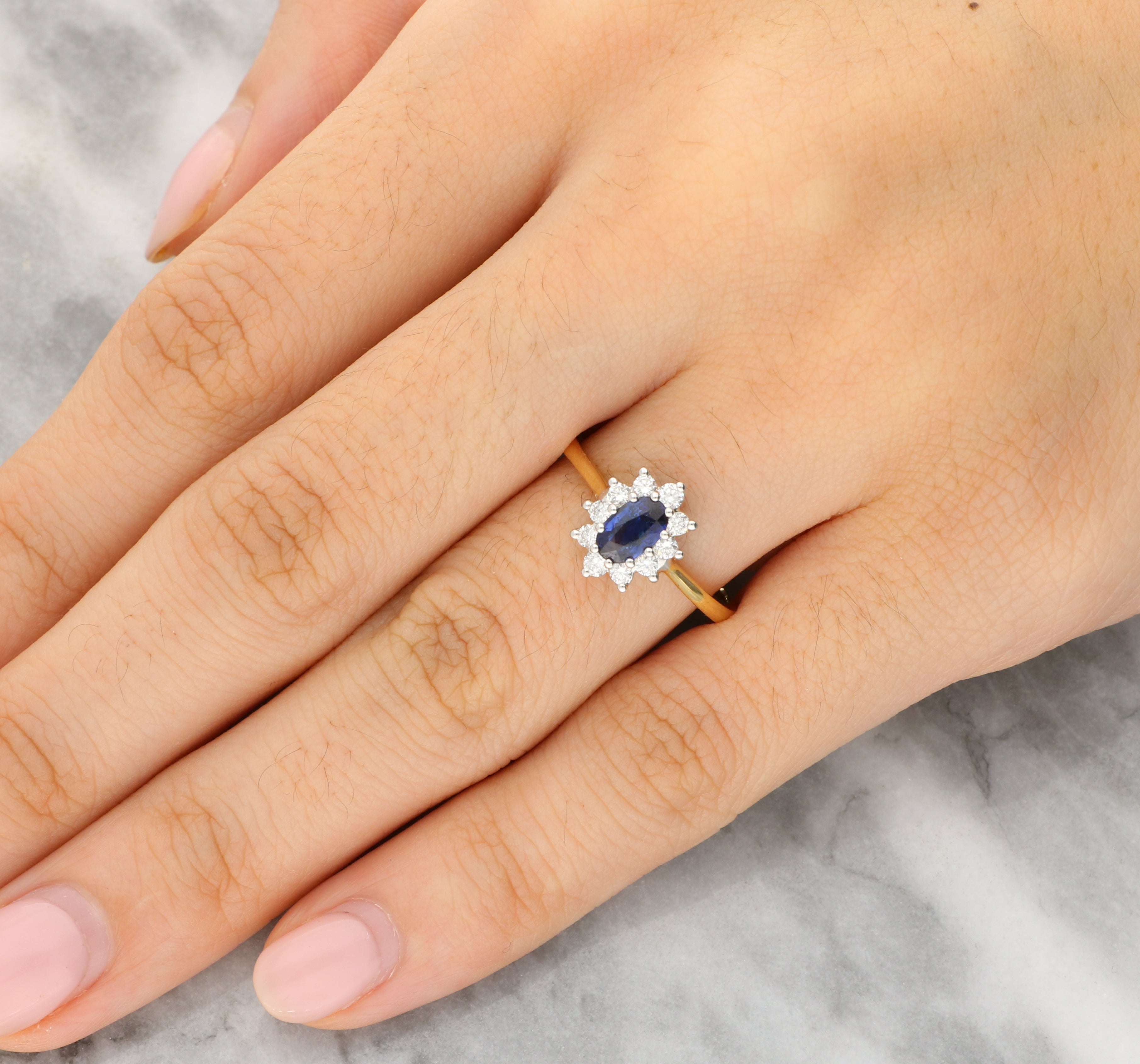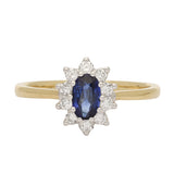 This lovely ring is crafted in a combination of 18ct yellow and white gold and set with a beautifully faceted oval sapphire at its centre. The gemstone displays a rich, velvety blue tone. Encircling the centre stone is a floral-inspired halo of round brilliant-cut diamonds, arranged to form a delicate starburst silhouette. The diamonds are claw-set in 18ct white gold to maximise their light, while the polished 18ct yellow gold band introduces warmth and a timeless contrast that enhances the overall design.