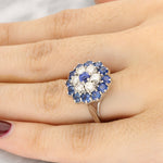 The layered arrangement forms a floral-inspired silhouette, a popular mid-20th century vintage style that emphasises brilliance and symmetry. This ring is perfect as a unique engagement ring, a September birthstone piece, or an elegant everyday heirloom.
