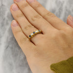 Each gemstone is securely set in a shared setting that allows light to enhance their natural brilliance, while the polished gold band provides a smooth and comfortable fit.