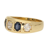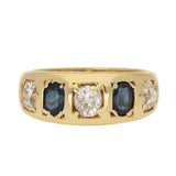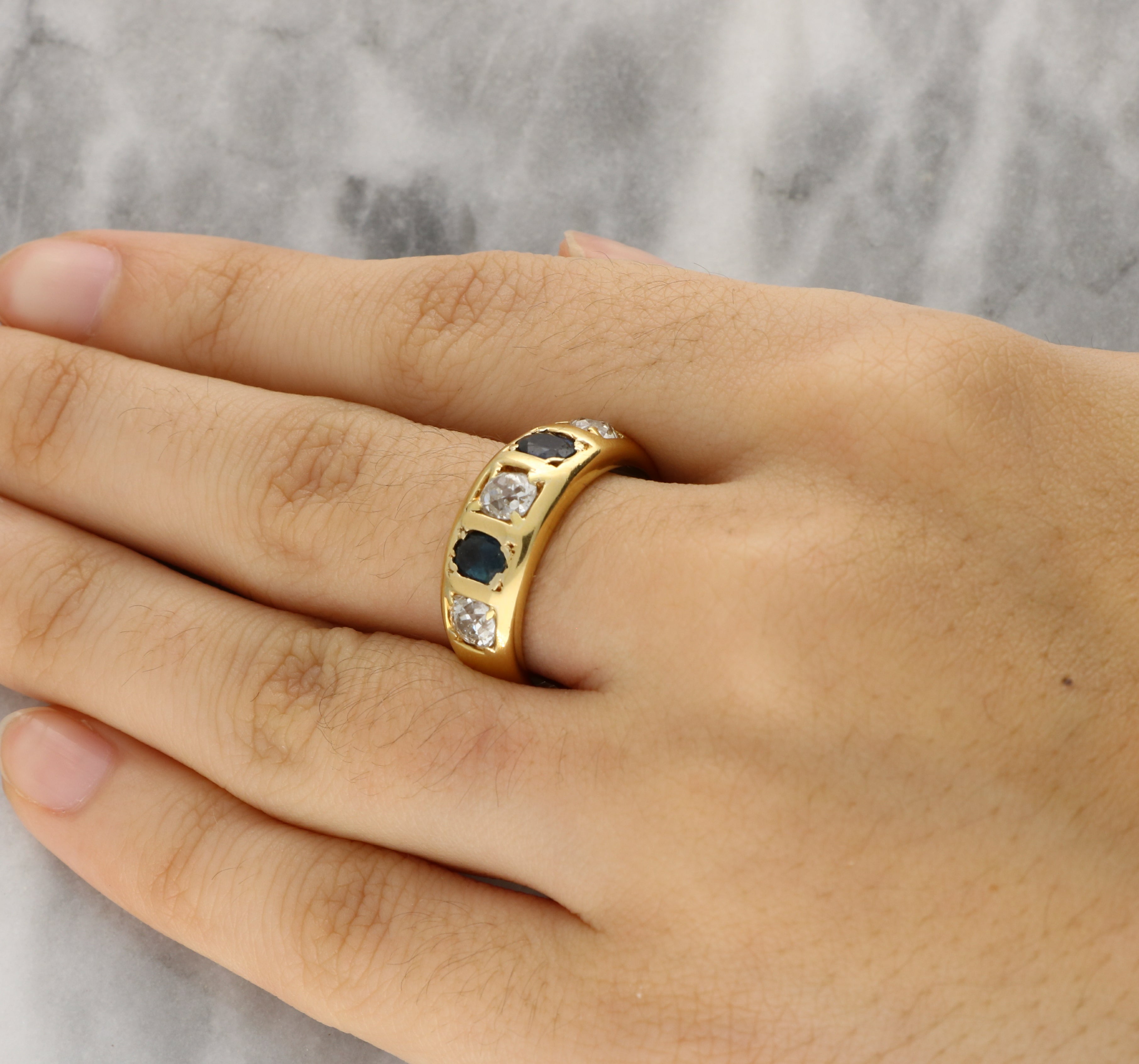 An elegant antique band ring of late Victorian to Edwardian date, crafted in 18K yellow gold and set with a sequence of alternating oval blue sapphires and old-cut diamonds. The gemstones are flush-set in individual square and oval apertures, creating a refined, rhythmic design across the face of the ring. The diamonds display the characteristic faceting of old mine and early old European cuts, while the sapphires exhibit a deep, rich blue hue.