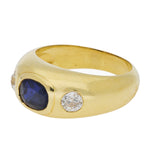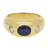 This french ring is set in yellow gold and features a central oval cut blue sapphire, rub over set into a wide gold band. To either side of the sapphire is a round old cut diamond, also rub over set, creating a three stone arrangement across the front of the ring.