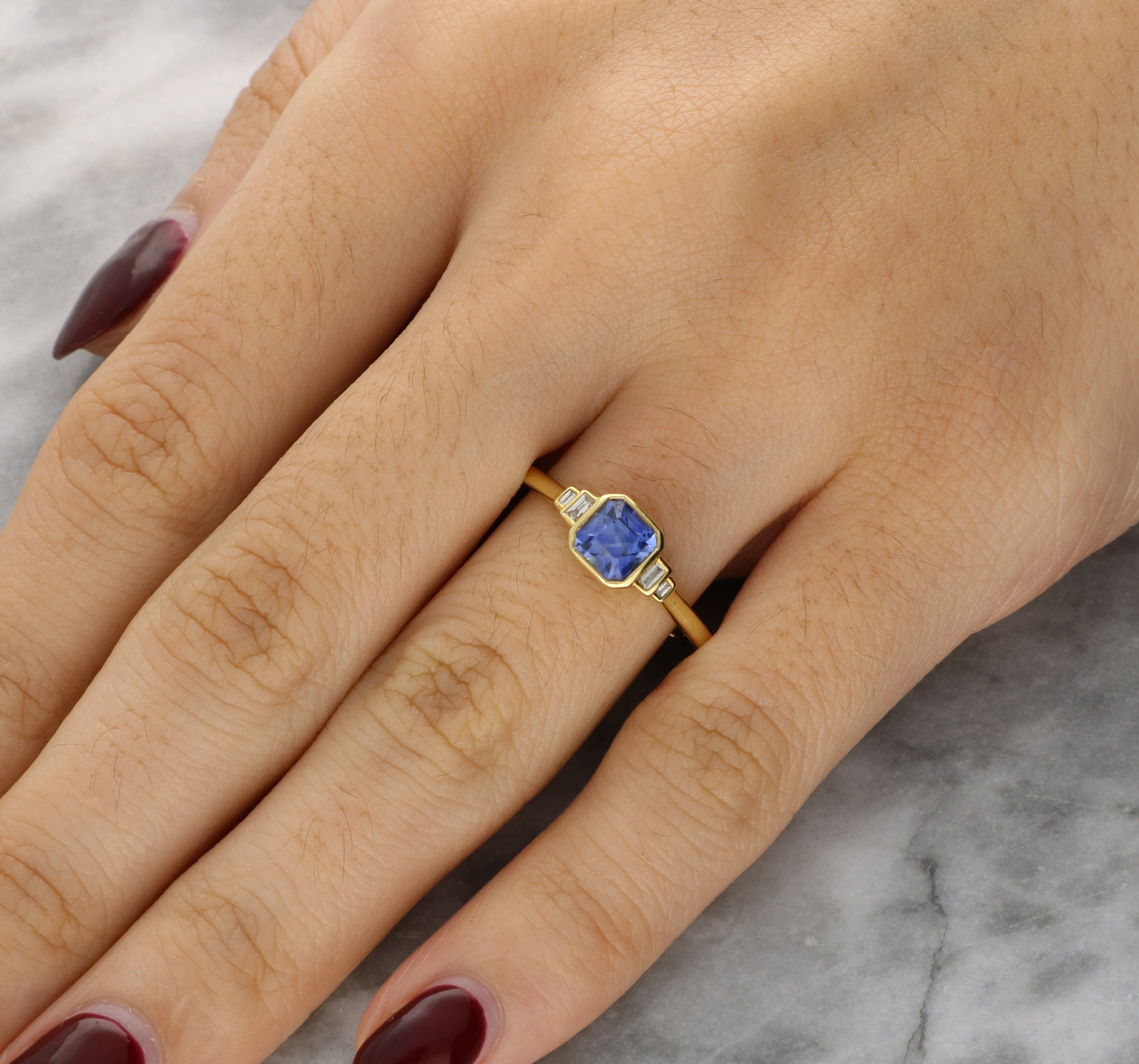 This lovely ring is centred on a beautifull cushion-cut blue sapphire, bezel-set in 18K yellow gold to highlight its rich, luminous colour and structured facets. Flanking the sapphire are tapered baguette-cut diamonds, also bezel-set, adding crisp brilliance and elegant symmetry.