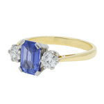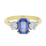 The ring centrally features an emerald cut blue sapphire which is securely four claw set in platinum. The sapphire is sided by two old cut diamonds similarly claw set. The head of the ring leads to a solid 18k gold band.