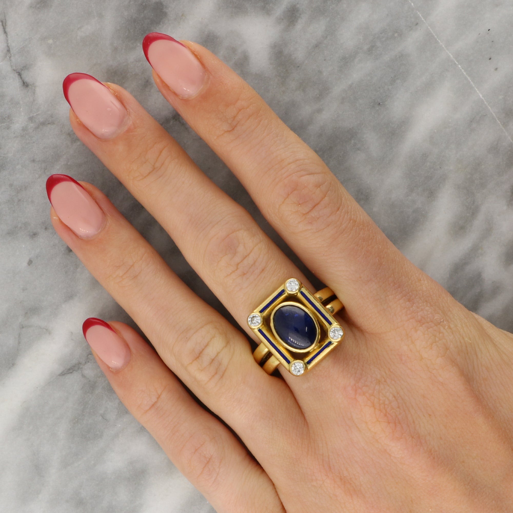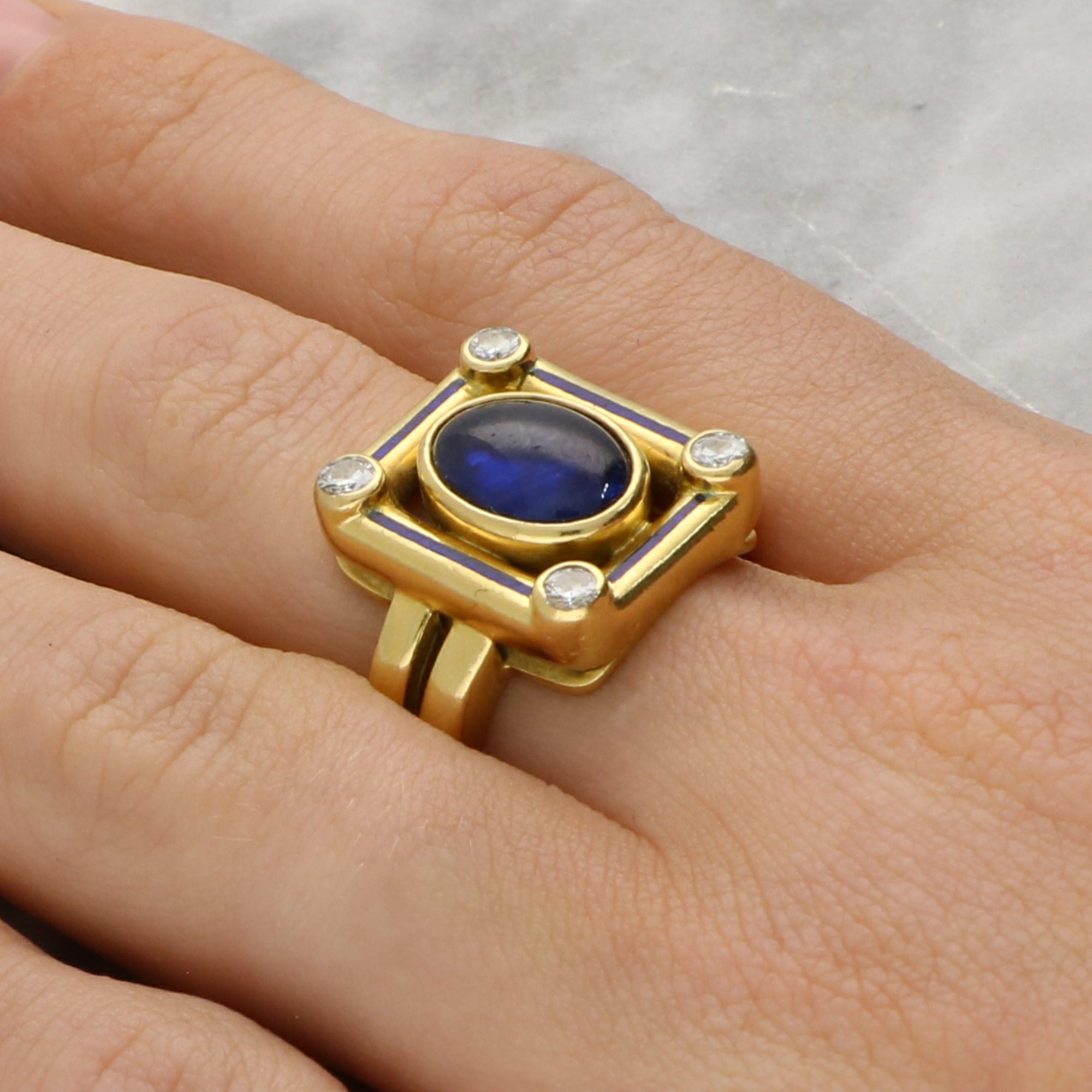 The ring head is composed of an openwork rectangular panel, centrally set with a cabochon blue sapphire. The sapphire is securely bezel set and bordered by matching blue enamel. To each corner is a bezel set round brilliant cut diamond adding perfect contrast to the blue elements within the design. The head of the ring leads to solid gold split shoulders.
