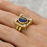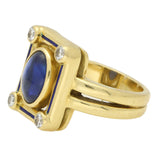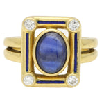 A highly unique vintage cabochon sapphire, diamond and enamel panel ring set in 18k yellow gold.