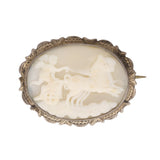 This elegant brooch dates to the Victorian period and features a finely carved shell cameo set within a silver mount. The oval cameo depicts a lively classical scene, showing a cherub driving a horse-drawn chariot, rendered in raised white relief against a softly translucent cream ground. The carving displays careful attention to movement and proportion, characteristic of skilled 19th-century cameo workmanship.