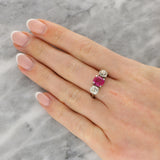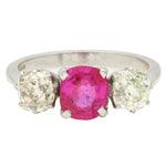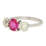 A vibrant vintage certified Burmese ruby and old cut diamond three stone ring set in 18k white gold.