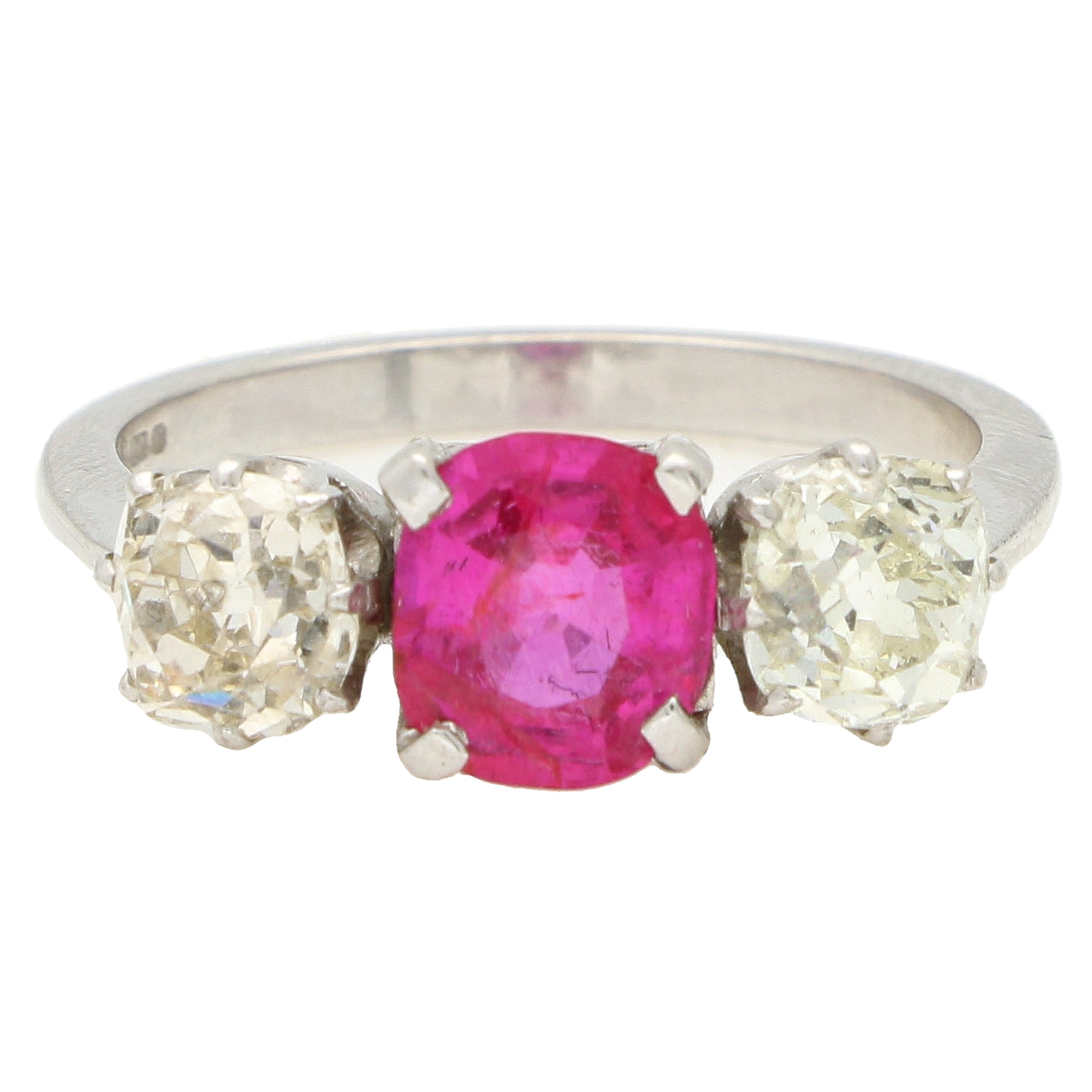 The ring is centrally set with a beautiful 1.52 carat cushion cut natural Burmese ruby which is four claw set securely. Siding the ruby are two well matched old mine cut diamonds, similarly claw set securely.