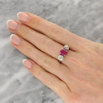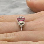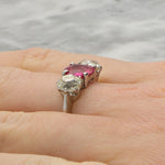 The ruby in this ring is simply beautiful. The stone has a natural pinkish-red to it, adding a lovely pop of colour with the hand. The siding diamonds were hand cut over 100 years ago, making the ring a true one of a kind!