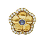 The piece is centrally set with a round cabochon-cut sapphire, securely bezel set in gold. Surrounding the sapphire are cabochon cut citrines, forming the petals of the ring. The outer cluster is set with 25 round-cut diamonds.