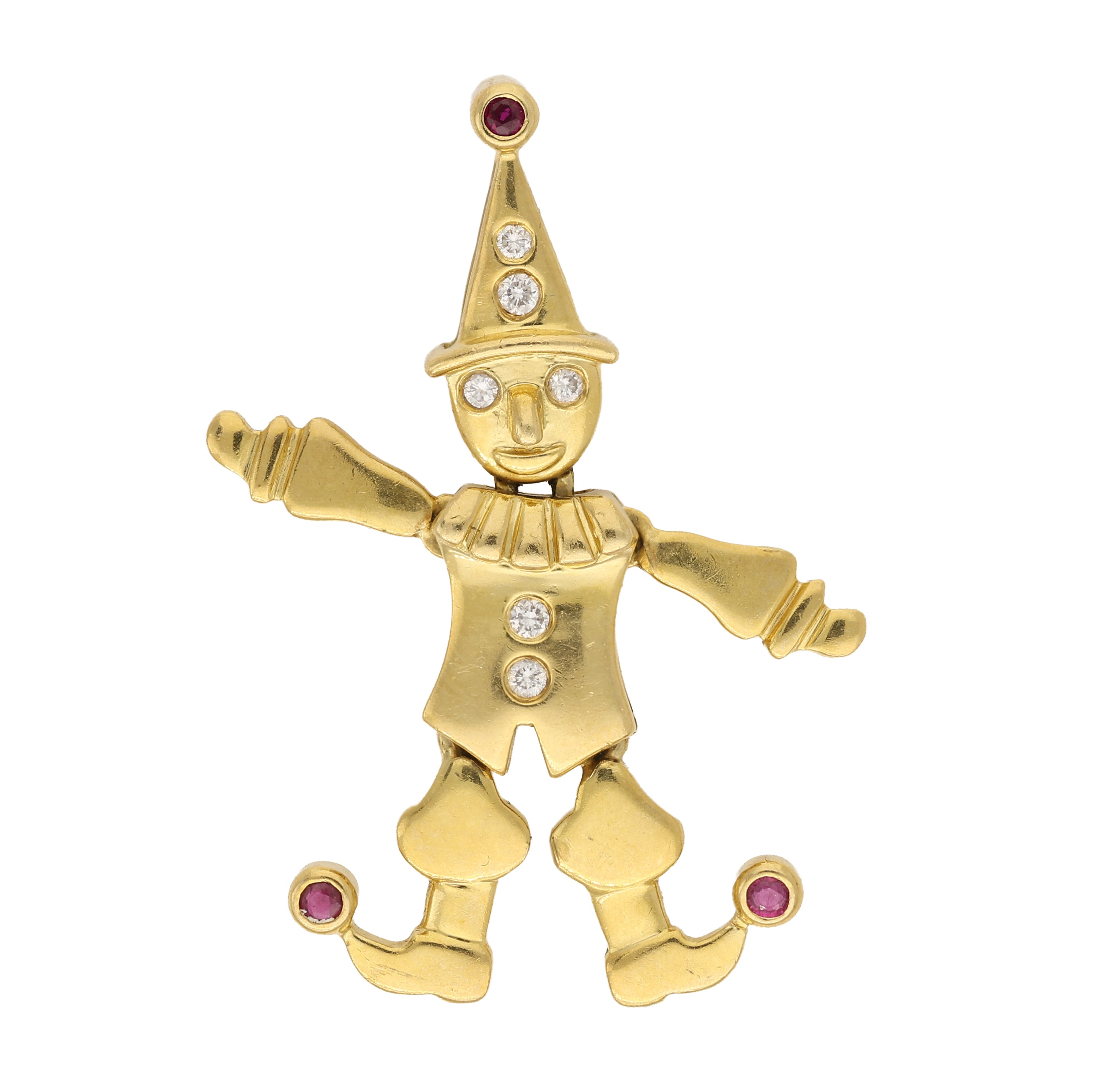 This delightful articulated clown brooch is crafted in 18K yellow gold, capturing a playful figure with outstretched arms and charming character. The design is highlighted with round brilliant-cut diamonds set to the hat, face and torso, while rich rubies accent the tip of the hat and the curled toes of the shoes, adding a vibrant touch of colour.