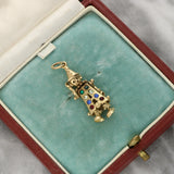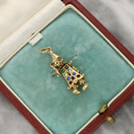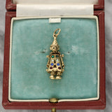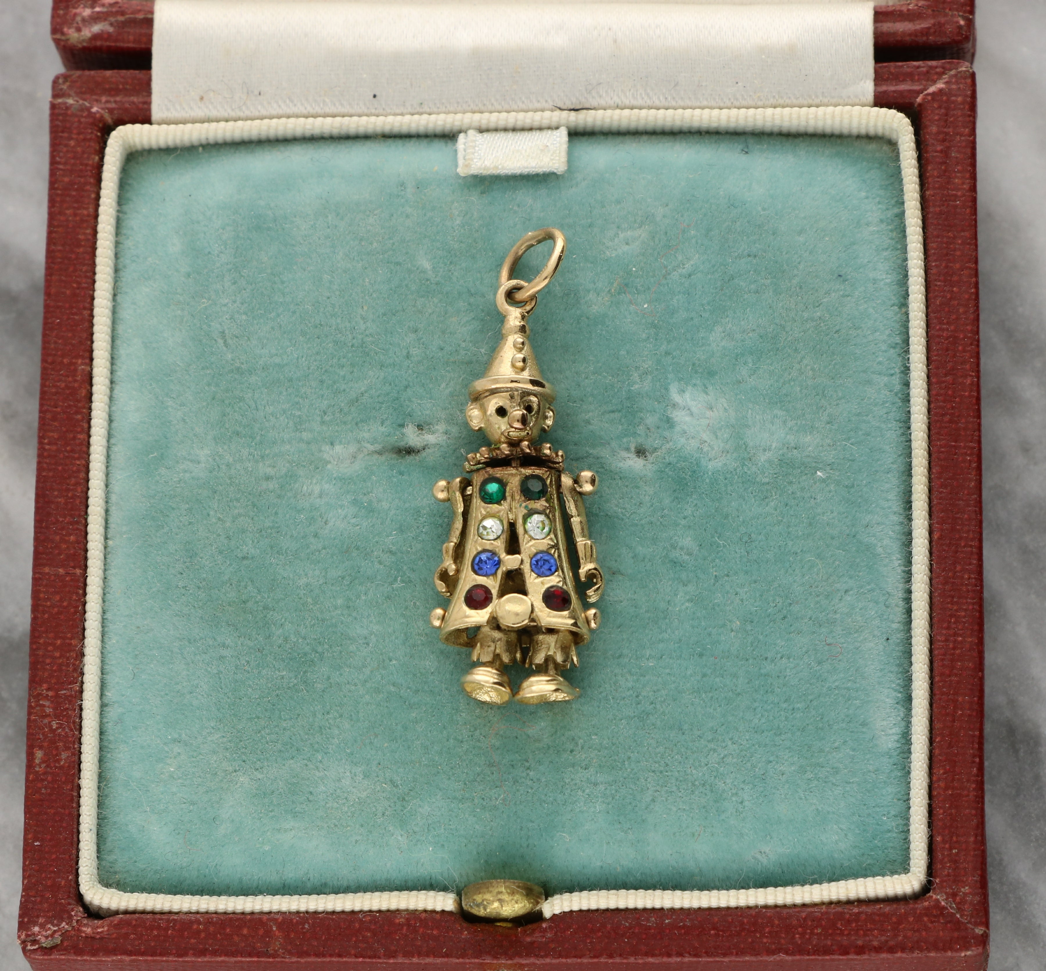 This charming pendant is crafted as an articulated clown figure, finely detailed with engraved features and playful proportions. The clown wears a pointed hat and stylised costume, with gemstone accents in green, white, blue, and red arranged down the front of the figure. The articulated arms add movement and character to the design, enhancing its charm and novelty.