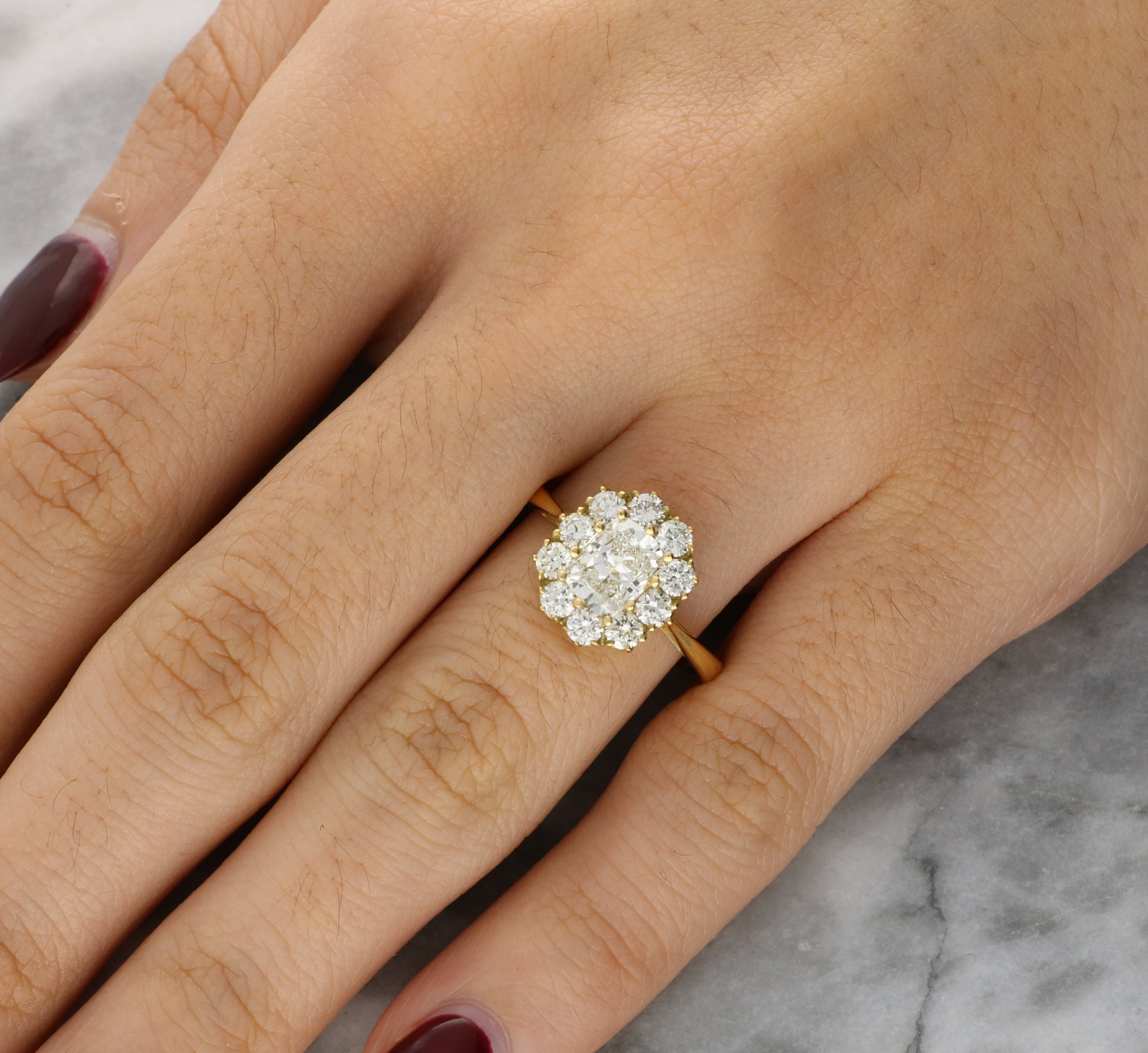 Vintage Cushion Cut Diamond Cluster Ring Set in 18 Carat Yellow Gold