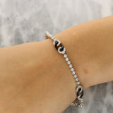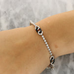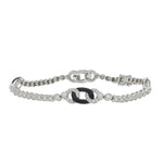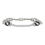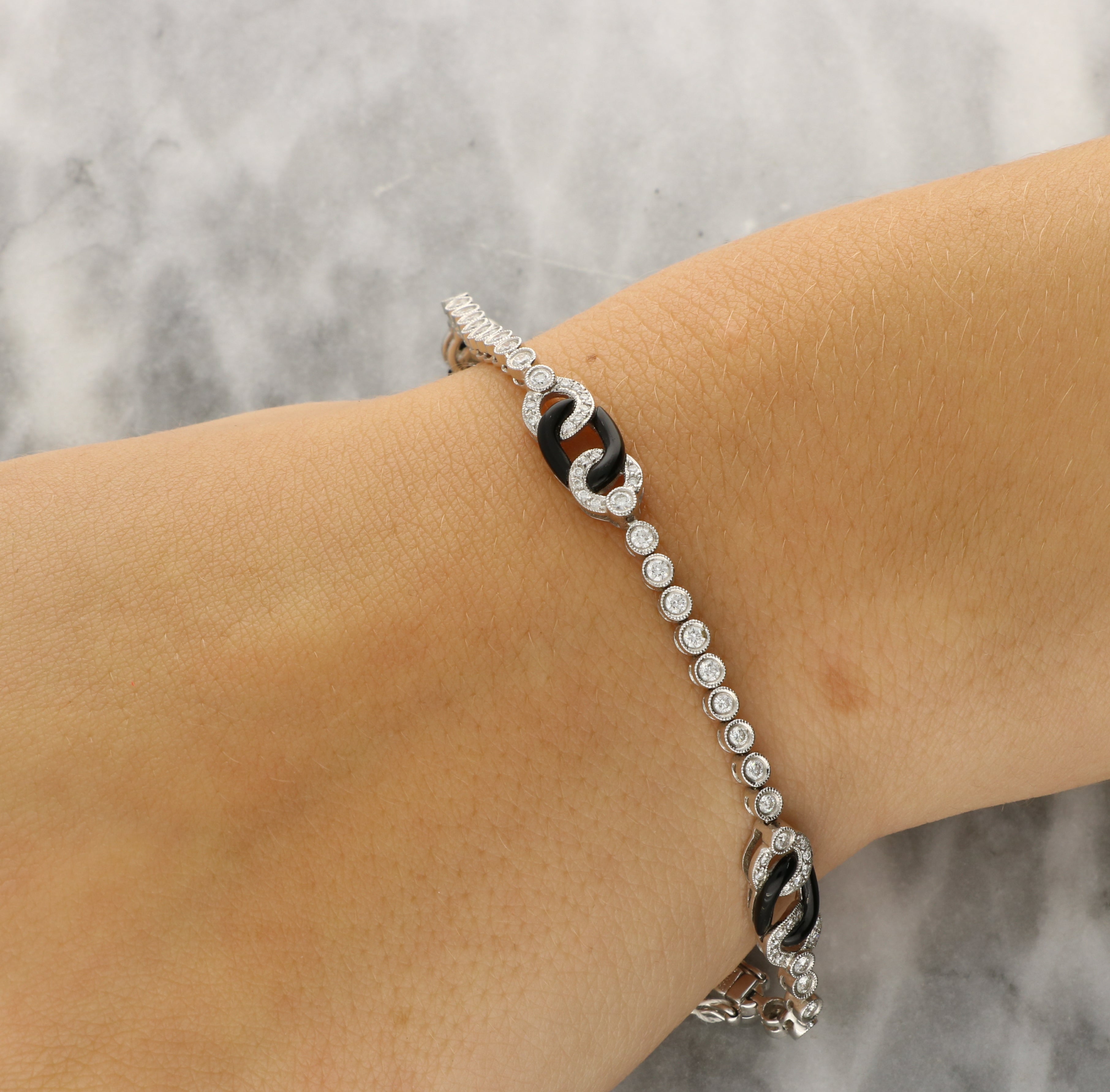 A beautifully designed diamond and onyx line bracelet, crafted in 18k white gold and featuring alternating sections of milgrain bezel set diamonds and polished onyx. The bracelet is set with round brilliant cut diamonds throughout, with four evenly spaced oval onyx sections adding striking contrast and Art Deco inspired design. Each onyx element is detailed with a looped circle of diamonds on either side, blending geometric symmetry with delicate sparkle.