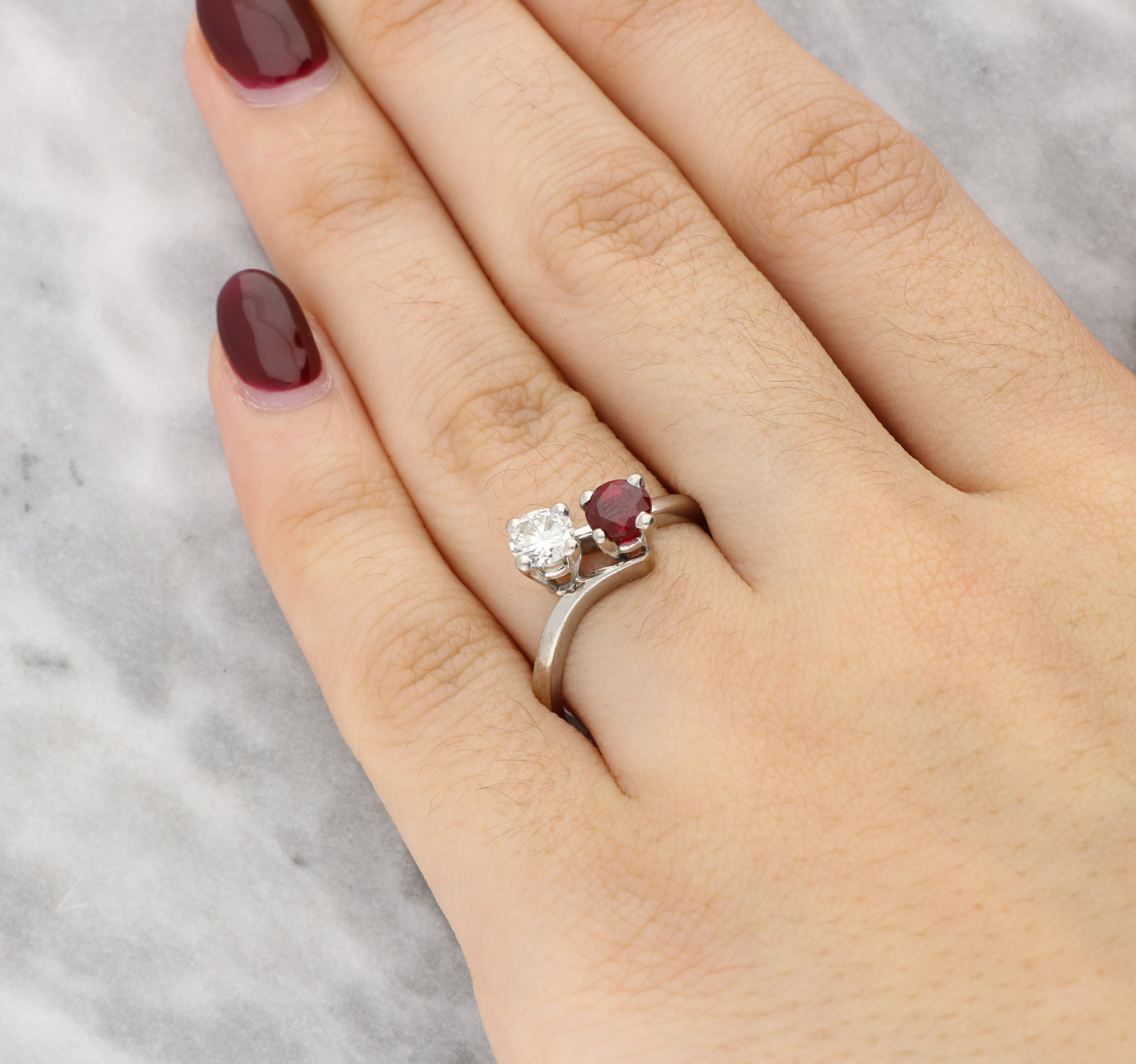 This lovely ring features a vibrant round cut ruby set alongside a brilliant round cut diamond in a classic “Toi et Moi” design. Each stone is secured in a simple claw setting, allowing maximum light to enhance their natural sparkle. The gently crossing shoulders create a graceful, flowing silhouette that beautifully balances the rich red of the ruby with the bright white brilliance of the diamond.